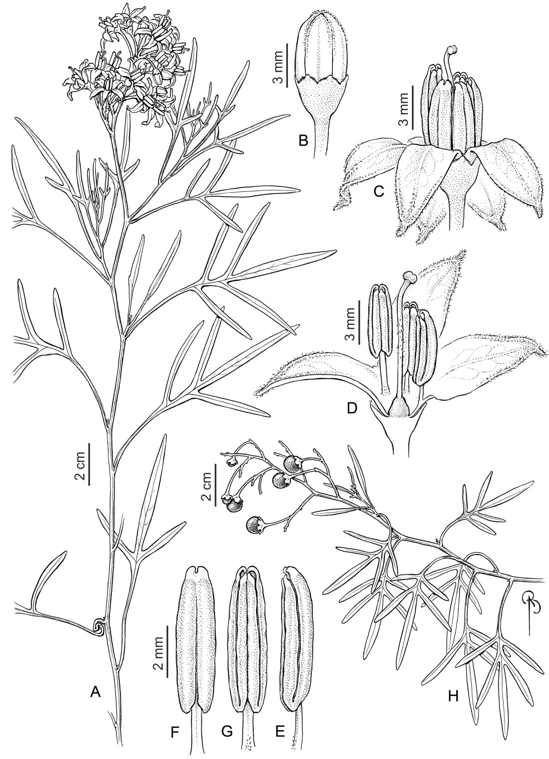 Arbustos laxos, escandentes, de 1-2 m; tallos erectos, glabros; corteza de tallos más viejos castaño-rojizo a gris. Unidades simpodiales plurifoliadas, no geminadas. Hojas profundamente pinnatífidas; pecíolos de 0,5-1,5 cm, glabros, a veces volubles; láminas elípticas, de 2-6,5 × 2-4 cm, base atenuada, membranáceas, glabras; nervios primarios 4-6 pares; folíolos 1-4 pares, de (0,5-) 2-2,5 × 0,3-0,4 cm, lóbulos angostos de ápice redondeado. Inflorescencia terminal o en ocasiones lateral, de 2-6 cm, varias veces ramificada, con 20-50 flores, glabra pero con unos pocos tricomas simples en el punto de inserción a los pedicelos; pedúnculo de 1-3 cm. Pedicelos delgados, de 0,7-1(-1,7) cm de largo y ca. 0,5 mm de diámetro en la base y el ápice, glabros, extendiéndose en la antesis, articulados en la base en una corta manga, dejando un pequeño gancho en el eje de la inflorescencia; cicatrices de los pedicelos irregularmente espaciados entre 1-4 mm; botones elipsoides; tubo calicinal cupuliforme de 1-1,5 mm, lóbulos deltodoies de 0,5-1 mm, glabros o diminutamente papilosos en las puntas; corola estrellada a estrellado-rotácea, lobada en los 2/3 a 3/4 de su longitud, lila, púrpura o a veces blanca, de 1,6-2 cm de diámetro, lóbulos de 6-9 × 3-4 mm, densamente papilosos en los márgenes y en el nervio central adaxialmente, glabros abaxialmente; filamentos libres de longitud variable: un filamento más largo que el resto, de 2-2,5 mm, los otros 4 de 1-1,5 mm, todos glabros, anteras amarillas, de 5-6 × 1- 1,5 mm; estilo de 9-11 mm, glabro, estigma capitado. Baya negra o violeta-negra, de 0,7-1 cm, pericarpo delgado, brillante, glabro; pedicelos fructíferos de 1-1,5 cm de largo y ca. 1,5 mm de diámetro en la base, leñosos, colgantes; cáliz fructífero ligeramente acrescente y rodeando apretadamente la parte inferior de la baya; semillas 10-20 por baya, castaño-pálidas, ca. 3 × 2,5 mm, testa con células cuadrangulares o circulares.