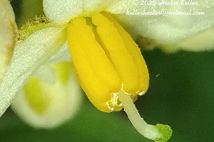 Arbustos hasta de 2 m de alto, con multiplicación vegetativa mediante raíces gemíferas; tallos erectos, con pubescencia densa a esparcida de tricomas dendríticos, ramas viejas con corteza castaño rojiza, brillante; brotes y órganos jóvenes con pubescencia densa o esparcida. Unidades simpodiales (2-)3-foliadas. Hojas comúnmente no geminadas; pecíolos de 3-12 mm; láminas elípticas a estrechamente elípticas, de (2-)3,5-15 × (0,6-)1-5,7 cm, base atenuada, ápice agudo o acuminado; venas laterales 10-12 pares; epifilo glabro o escasamente pubescente con tricomas simples 1-seriados y tricomas dendríticos; hipofilo glabro a densamente pubescente, con tricomas dendríticos. Inflorescencia internodal o terminal, de 2,5-10 cm, ramificada hasta 6 veces, con 50 a ca. 200 flores, pubescencia densa o esparcida de tricomas dendríticos; pedúnculo de 2-4 cm. Flores todas perfectas; pedicelos ca. 5 mm, recurvados en la antesis; cáliz con tubo cónico, ca. 1 mm, lóbulos estrechamente triangulares, de 1- 1,5 mm, escasamente pubescentes; corola hendida hasta ¾ de su longitud, blanca, de 0,8-1 cm de diámetro, lóbulos deltoides, planos o ligeramente reflexos en la antesis, de 5-8 mm, glabros o papilosos en el exterior; filamentos estaminales con la porción libre de 1-1,2 mm, porción fusionada nula, anteras de 2-2,5 × 1 mm, abriéndose por un poro y luego continuando por una línea; ovario cónico, glabro, estilo de 4-5 mm, recto, glabro, estigma capitado, diminutamente papiloso. Baya globosa, de 5-6 mm de diámetro, amarilla o anaranjada en la madurez, pericarpo delgado, pulpa pegajosa; pedicelos fructíferos leñosos, erectos, de 7- 9 mm, ensanchados en la inserción de la baya; semillas 6-8 por fruto, de 3-3,5 × 2-2,5 mm, amarillo-pálidas, aplanado-reniformes, tegumento finamente foveolado.