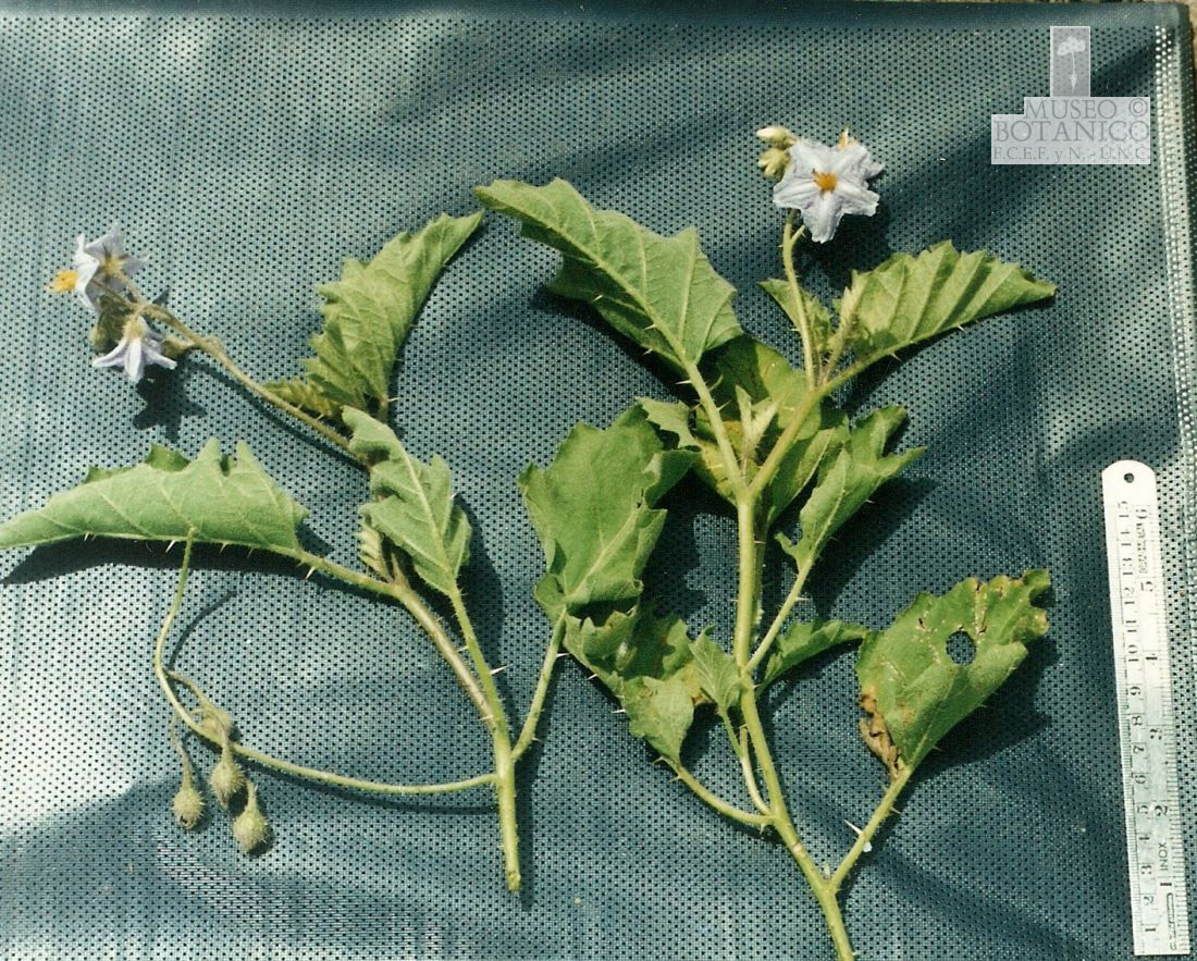 Hierbas perennes, andromonoicas, con raíces gemíferas; tallos rastreros o decumbentes, cubiertos por tricomas estrellados largamente estipitados, con 4 rayos laterales y uno central igual o mayor, 1- ó 2-celular, por acúleos subaciculares y por estructuras intermedias entre acúleos y tricomas. Pecíolos aculeados y con tricomas como los del tallo; láminas ovadas a orbiculares, aculeadas en ambas caras, con numerosas sinuosidades o lóbulos anchos y redondeados, base cordada, desigual o no, ápice obtuso; epifilo con tricomas estrellados cortamente estipitados, con unos 6 rayos laterales y uno central de igual longitud, a veces 2-celular, y con tricomas glandulares cortos y esparcidos; hipofilo con tricomas estrellados corta a largamente estipitados, con 5-8 rayos laterales y uno central igual o algo mayor. Inflorescencia pedunculada, no ramificada, con (2-)4(-6) flores perfectas y (0-)3(-6) flores estaminadas; pedúnculos y pedicelos con tricomas y acúleos como los del tallo. Cáliz con acúleos aciculares y tricomas estrellados largamente estipitados, lóbulos anchamente triangulares; corola rotácea, ca. 3,6 cm de diámetro, lilacina; anteras iguales, de 8-9 mm, amarillas. Baya casi completamente encerrada por el cáliz acrescente, de 1 cm de diámetro, amarilla, de consistencia dura, pericarpo poco carnoso; semillas ± 115 por fruto, de 3-4 mm, amarillas, rebordeadas.