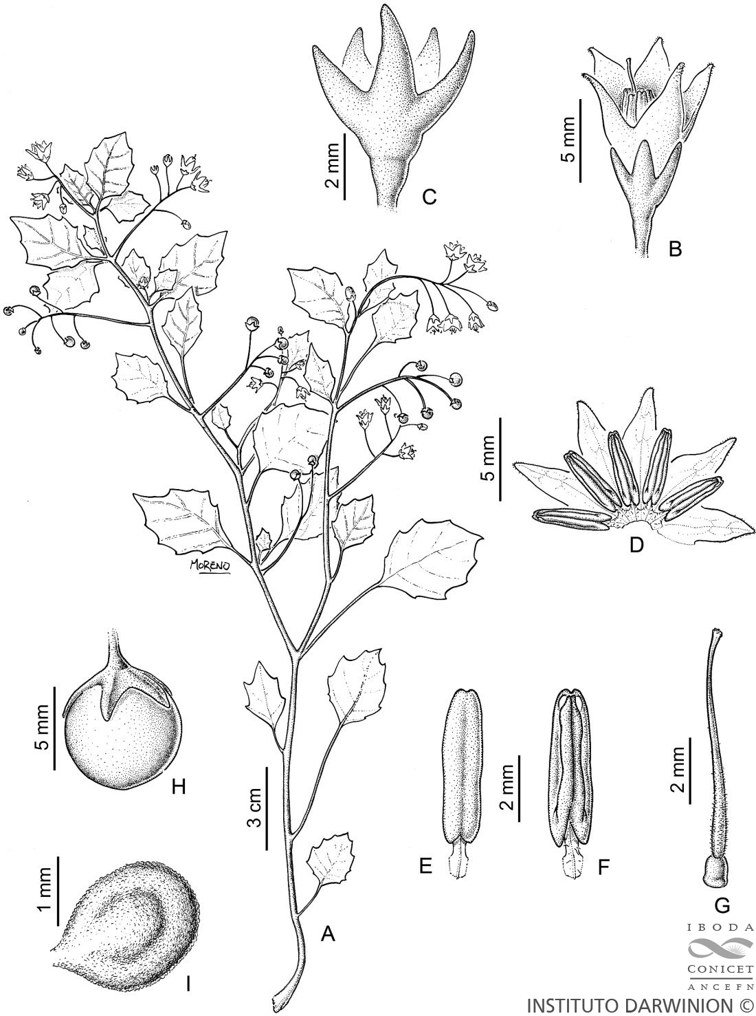 A. Rama con flores y frutos. B. Flor. C. Cáliz. D. Corola desplegada. E. Estambre, vista dorsal. F. Estambre, vista ventral. G. Gineceo. H. Fruto. I. Semilla.