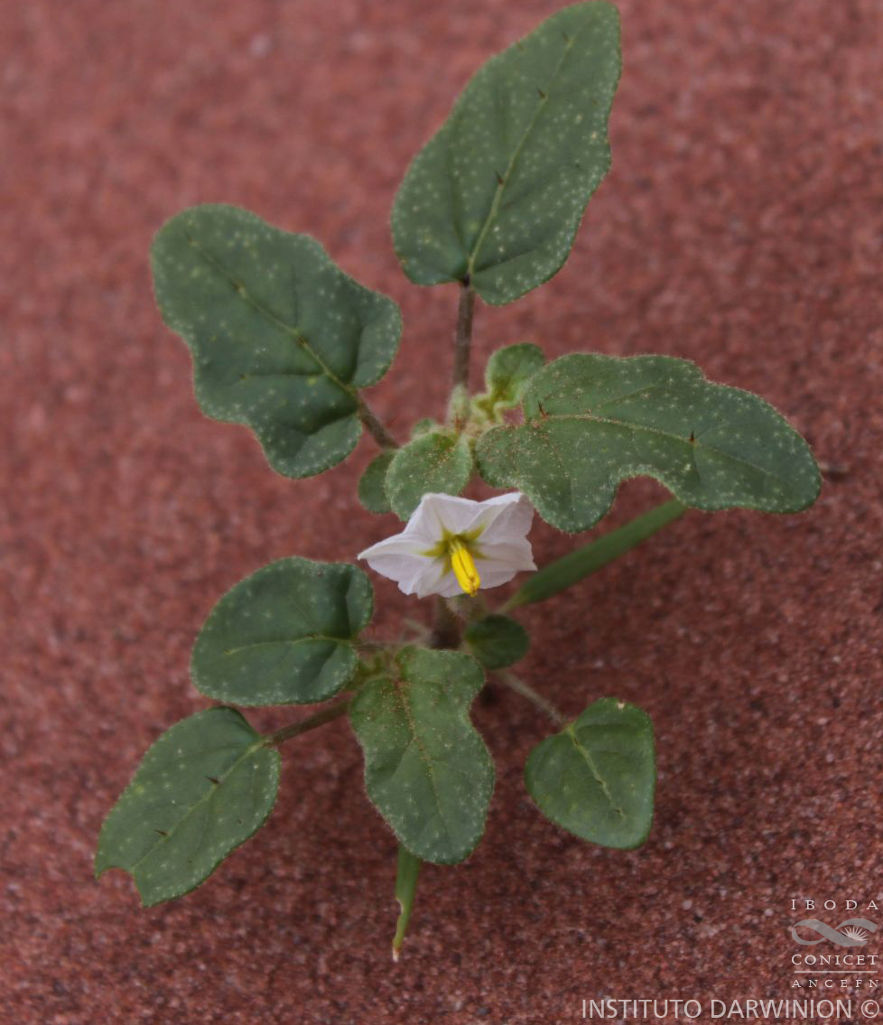 Hierbas anuales, hermafroditas, rastreras, formando matas entre 1-60 cm de diámetro; tallos muy ramificados, cubiertos de tricomas estrellados sésiles o cortamente estipitados con 5-9 rayos laterales y un rayo central 1- ó 2-celular mucho mayor, con aguijones aciculares, esparcidos o abundantes, que llevan tricomas glandulares en su base. Hojas pecioladas con algunos acúleos cónicos en ambas superficies; láminas elípticas u ovadas, enteras o por lo común sinuadas o con 4-6 pares de lóbulos redondeados, ápice obtuso, base desigual; epifilo con tricomas estrellados, sésiles, muy esparcidos; hipofilo con tricomas estrellados, sésiles o cortamente pedunculados, con 5-9 rayos laterales y un rayo central igual o algo mayor. Inflorescencia pedunculada, reducida a (1-)2(-4) flores, todas perfectas. Cáliz cubierto densamente por tricomas estrellados y por acúleos aciculares, lóbulos triangulares; corola blanca, de 7-8 mm, lóbulos anchamente triangulares; anteras amarillas, generalmente iguales, ca. 4 mm. Baya ca. 9 mm de diámetro, verde grisácea, pericarpo fino y seco que se desgarra irregularmente; cáliz fructífero acrescente que envuelve hasta la mitad o más a la baya dejándola expuesta a la madurez, con acúleos engrosados y coloreados de amarillo, anaranjado o morado; semillas ca. 60 por fruto, comprimidas, de 2,5-4 mm, negras, foveoladas.