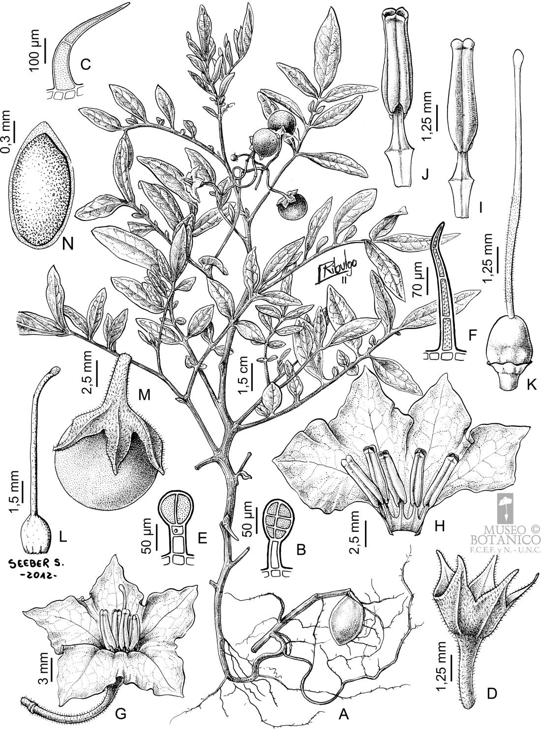 A. Planta fructífera. B. Tricoma glandular de hoja. C. Tricoma eglandular de hoja. D. Cáliz. E. Tricoma glandular de cáliz. F. Tricoma eglandular de cáliz. G. Flor y pedicelo. H. Sector de corola desplegada. I. Estambre, vista dorsal. J. Estambre, vista ventral. K, L. Gineceo. M. Fruto. N. Semilla.