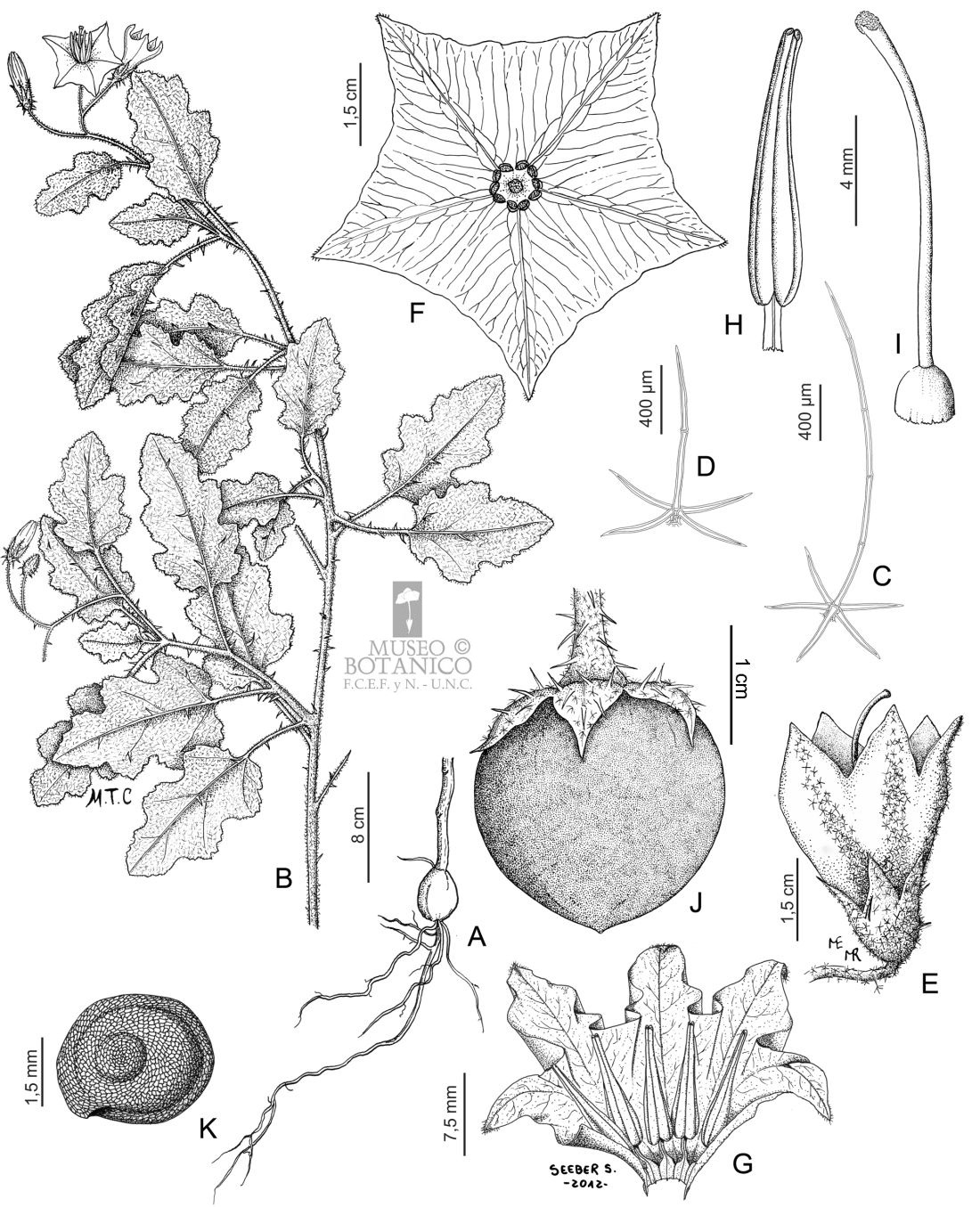 A. Raíz y tubérculo. B. Rama florífera. C. Tricoma estrellado de tallo. D. Tricoma estrellado de hipofilo. E. Flor. F. Flor, vista de arriba. G. Corola desplegada. H. Estambre, vista ventral. I. Gineceo. J. Fruto. K. Semilla.