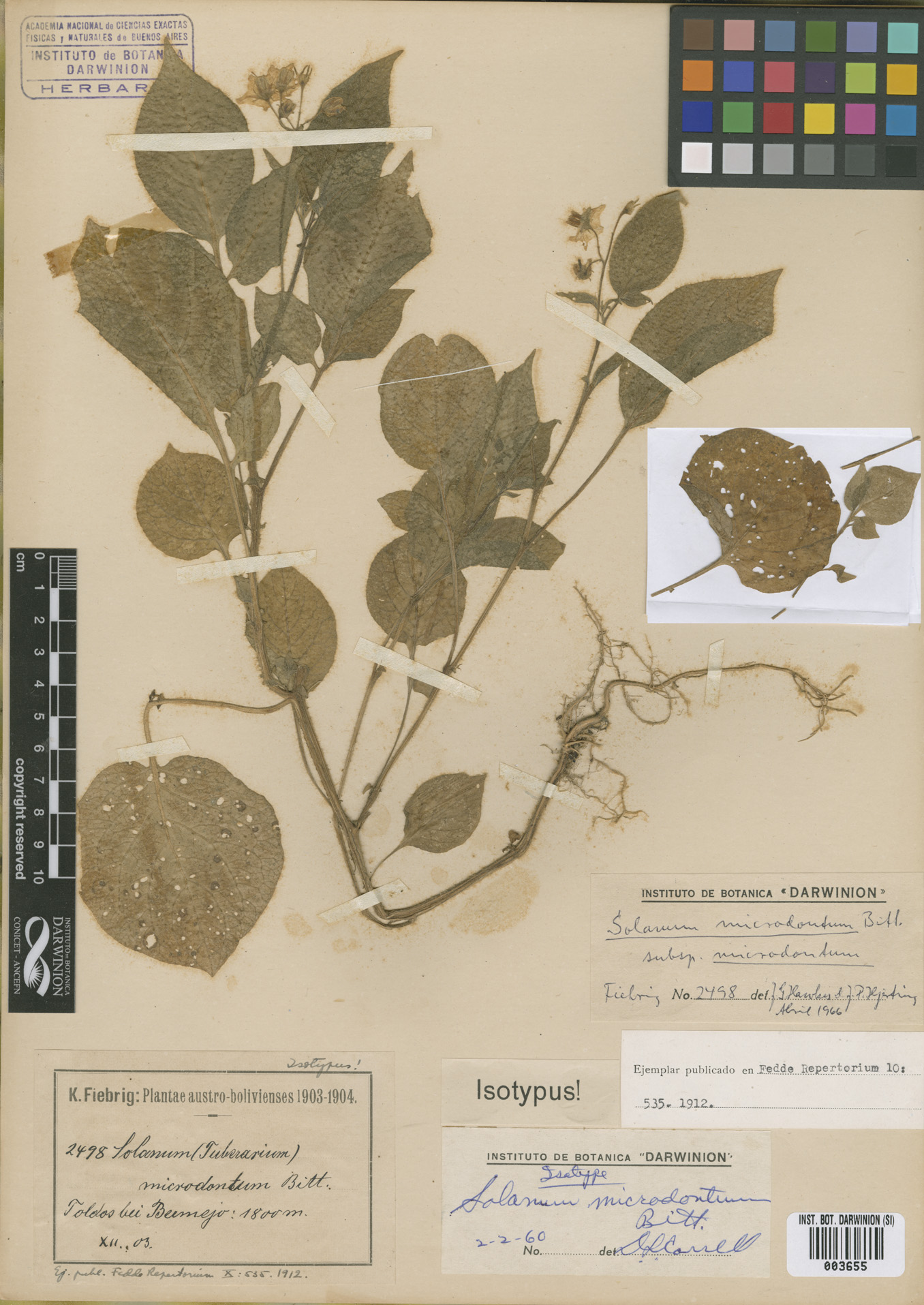 Material Tipo: Argentina. [Salta]. Toldos, cerca de Bermejo, 1800 m, Dic 1903, K. Fiebrig 2498 (lectotipo, W-1706!, designado por J. G Hawkes & J. P. Hjerting, The Potatoes of Argentina, Brazil, Paraguay and Uruguay: A biosystematic study: 319. 1969; isolectotipos, GOET!, MO 100314!, SI!, U- 054149!).