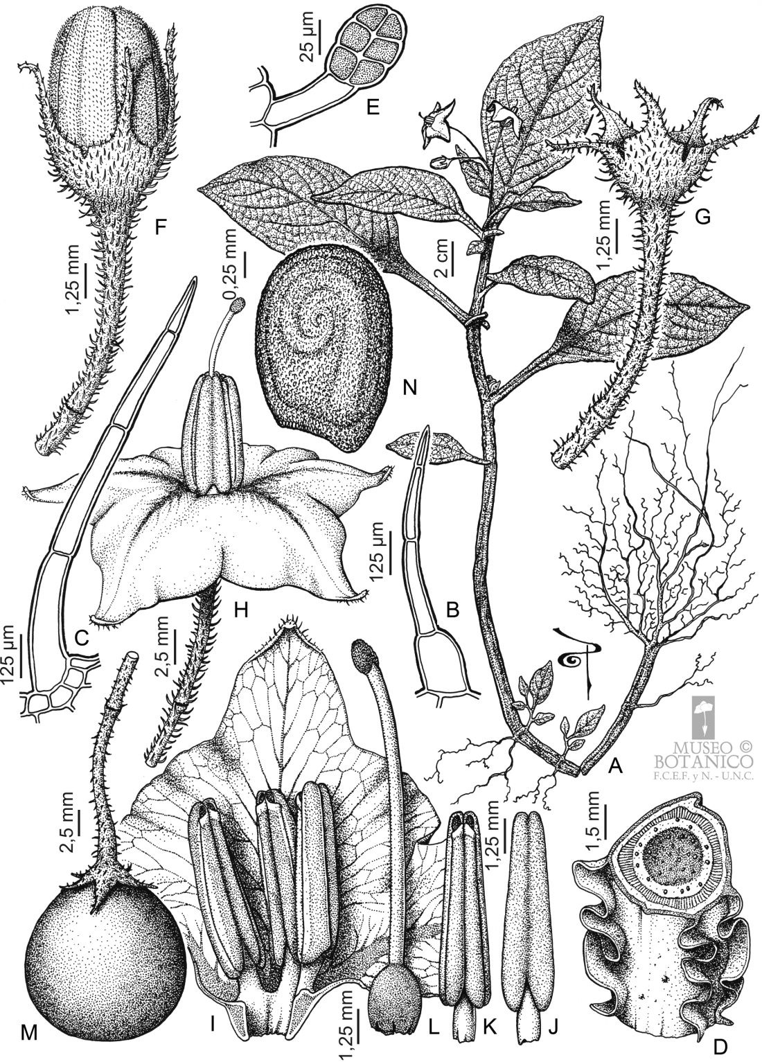 A. Planta florífera. B-C. Tricomas eglandulares de tallo. D. Sector del tallo, corte transversal con alas en los ángulos. E. Tricoma glandular de hoja. F. Botón floral. G. Cáliz. H. Flor y pedicelo. I. Sector de corola desplegada. J. Estambre, vista dorsal. K. Estambre, vista ventral. L. Gineceo. M. Fruto. N. Semilla.