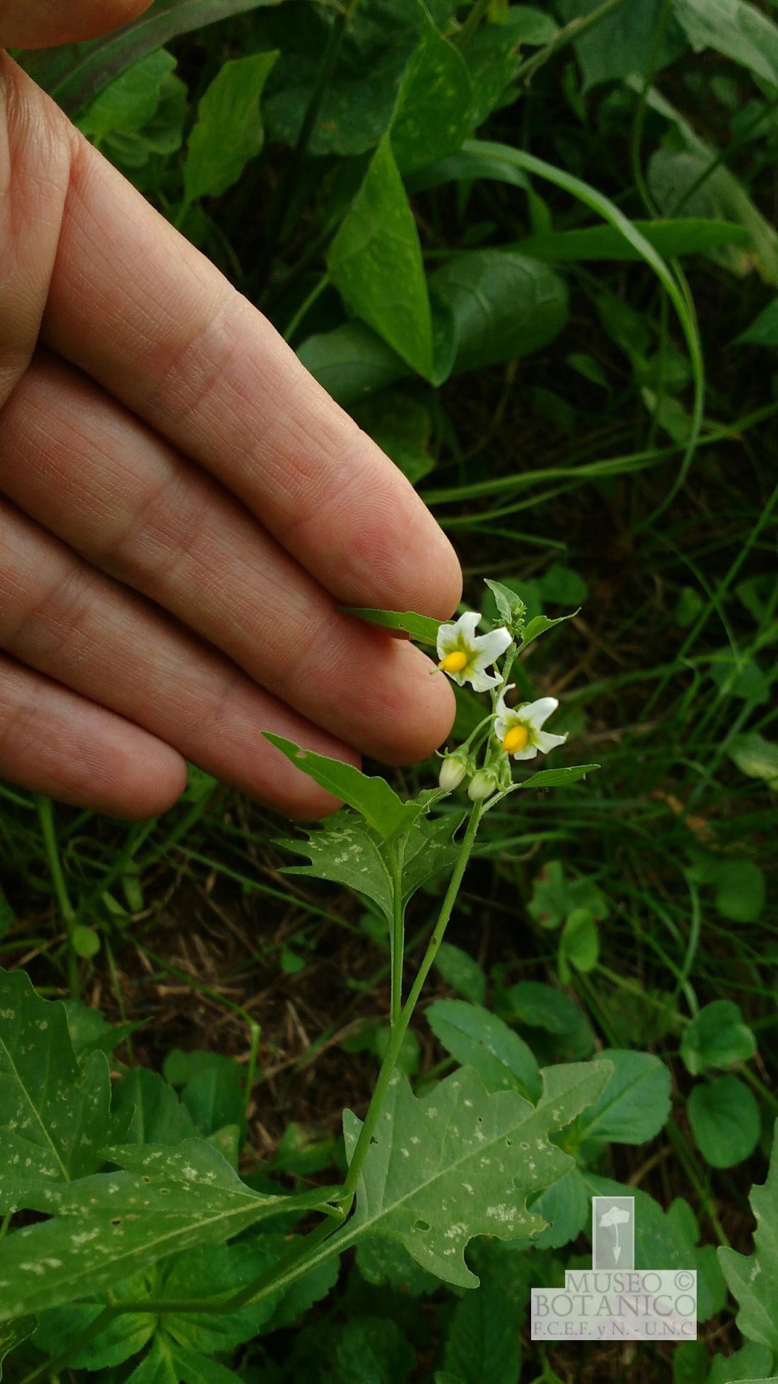 Hierbas perennes, pequeñas, hasta ca. 30 cm de alto, con rizomas y raíces gemíferas; tallos decumbentes o ascendentes, delgados, débiles, poco ramosos, angulosos, con aristas angostamente aladas, sin procesos espinulosos, pubescentes, con tricomas eglandulares cortos, antrorsos. Unidades simpodiales 1-foliadas. Hojas pecioladas; pecíolos de 0,5-1,7 cm, glabrescentes; láminas ovadas o angostamente elípticas, de 1-5 × 0,5-2,2 cm, base apenas desigual, atenuada, ápice agudo u obtuso, margen entero o con 2-4 dientes poco profundos y desiguales en cada semilimbo; epifilo e hipofilo glabros, excepto en los márgenes, con tricomas eglandulares, cortos, antrorsos; nervios principales 4 pares, marcados abaxialmente. Inflorescencia por lo general subopuesta a las hojas o extra-axilar, a veces de apariencia terminal, simple, apenas alargada, con (2-)4-6 flores; pedúnculos de 1,5-2,6 cm, delgados, glabrescentes. Botones florales globosos o anchamente ovoides; pedicelos de 6-13 mm, articulados en la base sobre una pequeña plataforma; cicatrices de los pedicelos espaciadas entre 0-2,5 mm; cáliz campanulado, de (2-)3,2-3,75(-4) mm, pubescente, lóbulos angostamente elípticos, ca. 1,5-1,8 × 0,5 mm; corola estrellada, de 9-12 mm, blanca o blanco-azulada, con centro pardo-verdoso, lóbulos triangulares, de 5-6,7 × ca. 2 mm, pubescentes por fuera; filamentos adheridos a ca. 1,6 mm de la base de la corola, porción libre de 1-1,2 mm, pubescente, anteras oblongo-elipsoides, de (3-)3,5-3,8 × 0,7- 1 mm, amarillas; gineceo de 7-7,5 mm, ovario globoso, glabro, estilo cilíndrico, de 6,3 mm, sobrepasando a las anteras en 1,25-2 mm, recto, pubescente en su mitad basal; estigma capitado. Baya subglobosa, 8-10 mm de diámetro, negruzca cuando madura, pericarpo con numerosos esclerosomas, más de 5, de 1,6-1,7 mm de diámetro; pedicelos fructíferos deflexos, de 12-15 mm, ensanchados en la zona de inserción con la baya; cáliz fructífero poco acrescente, cubriendo parcialmente la baya, los lóbulos adpresos a la baya; semillas más de 50 por fruto, subreniformes, de 1,8- 1,95 × 1,2-1,4 mm, amarillo-pálidas, tegumento reticulado, con células de paredes más o menos rectas.