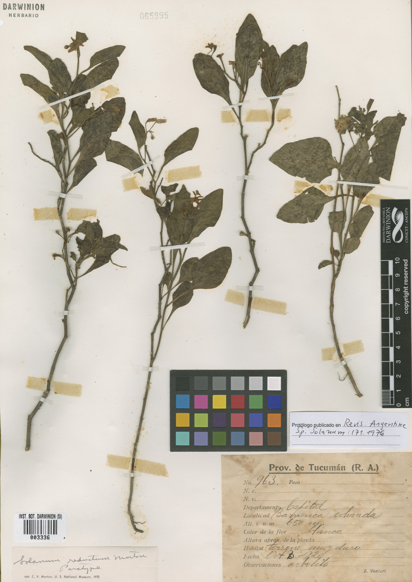 Observaciones: Nombre vulgar. «Fruta de loro». Esta especie es de posición incierta: reúne mucho de los rasgos que caracterizan al grupo Cyphomandra; no obstante, difiere en el hábito y en la forma y color de las semillas. Además, presenta cromosomas pequeños (Moyetta et al., com. pers.), a diferencia del resto de las especies del grupo, que son notables dentro de Solanum por sus cromosomas grandes. Por lo tanto, se incluye a S. reductum dentro de este grupo en forma provisoria, hasta tanto se cuente con más evidencias que aclaren sus relaciones filogenéticas.