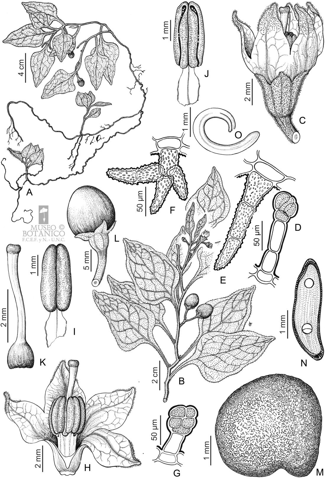 A. Sistema radical y brotes aéreos. B. Rama. C. Flor. D. Tricoma glandular de la superficie externa del cáliz. E. Tricoma eglandular de la superficie externa del cáliz. F. Tricoma ramificado de la superficie externa del cáliz. G. Tricoma glandular del interior del cáliz. H. Flor, con un lóbulo corolino removido. I. Estambre, vista dorsal. J. Estambre, vista ventral. K. Gineceo. L. Fruto. M. Semilla. N. Semilla, corte transversal. O. Embrión.