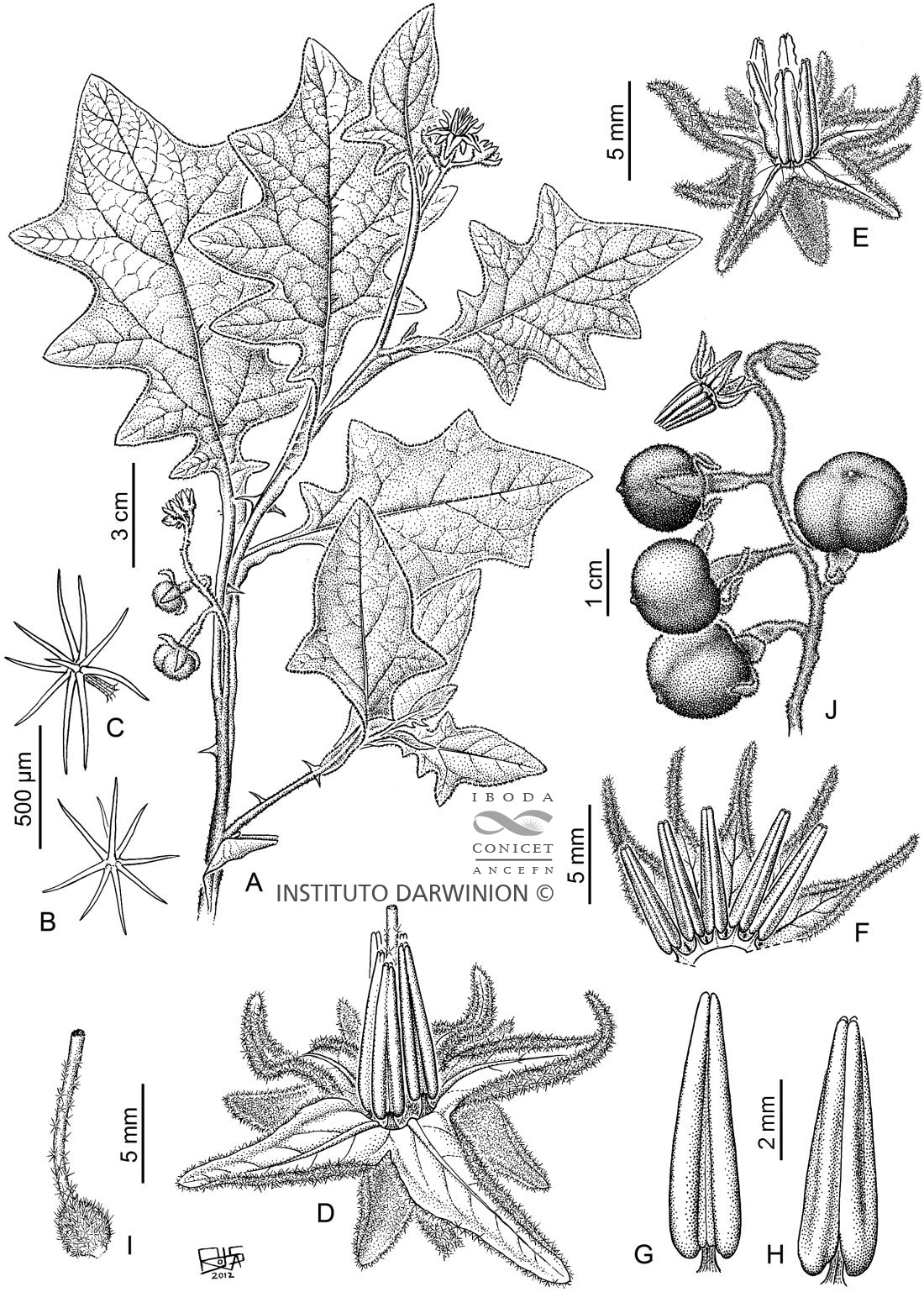 A. Sector de rama con flores y frutos. B-C. Tricomas estrellados de hoja. D. Flor longistilada. E. Flor brevistilada. F. Corola desplegada. G. Estambre, vista dorsal. H. Estambre, vista ventral. I. Gineceo de flor longistilada. J. Frutos.
