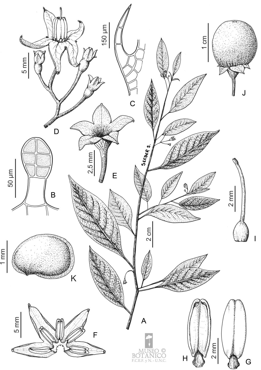 A. Rama florífera. B. Tricoma glandular del hipofilo. C. Tricoma eglandular del margen foliar. D. Inflorescencia. E. Cáliz. F. Corola desplegada. G. Estambre, vista dorsal. H. Estambre, vista ventral. I. Gineceo. J. Fruto. K. Semilla.