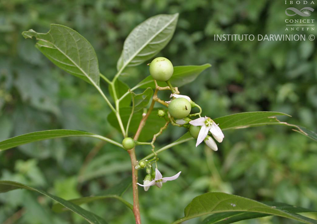 Arbustos o árboles pequeños de 2-5(10) m de alto, con tronco hasta de 20 cm de diámetro en la base; ramas y hojas jóvenes glabras y brillantes; ramas viejas con corteza amarillenta. Unidades simpodiales 2-foliadas, anisofilia presente. Hojas geminadas; láminas elípticas, con el ancho máximo en la zona media, base aguda o atenuado-decurrente, ápice acuminado, glabras excepto por mechones de tricomas simples 1-seriados restringidos a las axilas de los nervios en el envés; hojas mayores con pecíolos de 1-1,8 cm y láminas de (9-)12-15(-16) × (2,5-)3-4(-6) cm, con 10- 12 pares de nervios; hojas menores con pecíolos de 5-10 mm; láminas de forma similar a las mayores, de 3-8 × 1-3,5 cm. Inflorescencia lateral, opuesta a las hojas (a veces de apariencia terminal por sobrepasar al brote apical de los tallos), simple, (7-)10- 30(-58)-flora, glabra; pedúnculos de (1,5-)1,8-(3) cm; cicatrices de los pedicelos espaciadas a lo largo del raquis, a 0,5-2 mm de distancia entre sí; raquis de (2-)4,5(-7) cm. Pedicelos de (0,7-)0,9-1 (-1,5) cm en la antesis; cáliz en forma de copa, truncado, de 1-1,5 mm, con pubescencia esparcida de tricomas simples 1-seriados, lóbulos cuadrangulares terminados en un apículo que lleva un mechón de tricomas simples 1-seriados; corola hendida hasta los ¾ de su longitud, blanca, de 6-10 mm de diámetro, lóbulos reflexos, con pequeños tricomas glandulares en los márgenes; filamentos en su porción libre de 0,1-0,5 mm, porción fusionada ca. 0,5 mm; anteras de 2,5-3 × 1 mm, abriéndose por poros apicales en forma de gota; ovario glabro, estilo recto de 4,5-6 mm, estigma capitado-2-lobado, papiloso. Baya globosa, de (7-)8-9(-13) mm de diámetro, verdosa; pedicelos fructíferos de 1,5-2 cm, leñosos, reflexos, ensanchados en la inserción con el cáliz; semillas aplanado-reniformes, de 2-3 × 1,5 mm, castañas, con márgenes engrosados, tegumento foveolado.