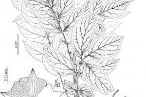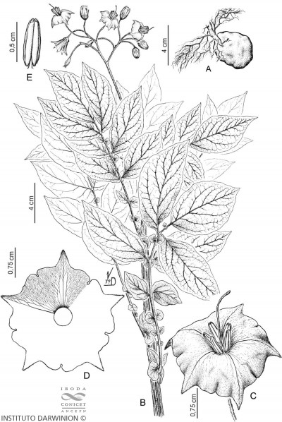 Hierbas perennes de 40-150 cm de alto, erectas; tallos de 3- 8 mm de diámetro en la base de la planta, sin alas o con alas hasta de 1,5 mm de ancho, verdes a morados o moteados de color verde y púrpura, con pubescencia corta a casi canescentes. Pseudoestípulas de 4-17 mm, pubescencia similar a la de los tallos. Pecíolos de 0,5-3,5 cm, pubescentes, con tricomas similares a los tallos; láminas imparipinnadas, de 9-29 × 8-17 cm, verdes, escasa a densamente pubescentes en la cara adaxial, densamente pubescentes a subcanescentes en la abaxial; folíolos laterales 3-4 pares, frecuentemente subiguales con excepción de los 1 ó 2 pares más proximales que son más pequeños; folíolos laterales más distales sésiles o con peciólulos hasta de 10 mm, elípticos a anchamente ovados, de 5-11 × 2,3-4,8 cm, ápice agudo a acuminado, raramente obtuso, base típicamente oblicua sobre el lado basiscópico y presentando decurrencia sobre el pecíolo, a veces cuneada a redondeada, sin folíolos terciarios sobre el peciólulo o raramente 2; folíolo terminal ovado a elíptico, de 4,5- 14,5 × 2-7 cm, de base atenuada a aguda, raramente cordada, con ápice agudo a acuminado, frecuentemente con 1-4 folíolos terciarios pequeños e imparipinnados sobre el peciólulo; folíolos intersticiales 2-14, sésiles a cortamente peciolulados, ovados a orbiculares. Inflorescencia de 4-9 cm, generalmente dividida, con 9-21 flores, los ejes pubescentes, con pelos similares a los de los tallos; pedúnculo de 2,3-11,5 cm. Pedicelos de 12-28 mm en flores y frutos, articulados en la mitad o ligeramente sobre la mitad de su largo; cáliz de 3,6-5 mm, lóbulos de 1,6-4 mm, largamente atenuados, acúmenes de 1-2 mm, con tricomas similares a los de los tallos; corola pentagonal a rotácea, de 2-3,5 cm de diámetro, púrpura-violeta o violeta pálido, frecuentemente con rayos más oscuros en las caras abaxial y adaxial, acúmenes de 2-4 mm; anteras de 4-6 mm; estilo de 8-10 mm, excediendo a los estambres en 2-4,5 mm, estigma clavado o capitado. Fruto globoso, de 1,4-2 cm de diámetro, verde a la madurez, frecuentemente con manchas blancas, glabro.