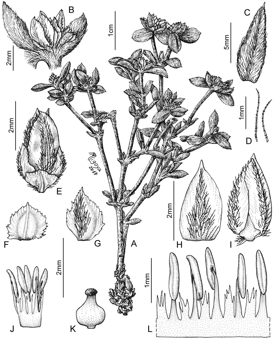 A. Planta. B. Pseudoespiga en la axila de una hoja. C. Hoja. D. Tricomas armados y barbelados de las hojas. E. Flor con bráctea y bractéolas. F. Bráctea. G. Bractéola. H. Sépalo externo. I. Sépalo interno. J. Androceo. K. Gineceo. L. Androceo desplegado.
