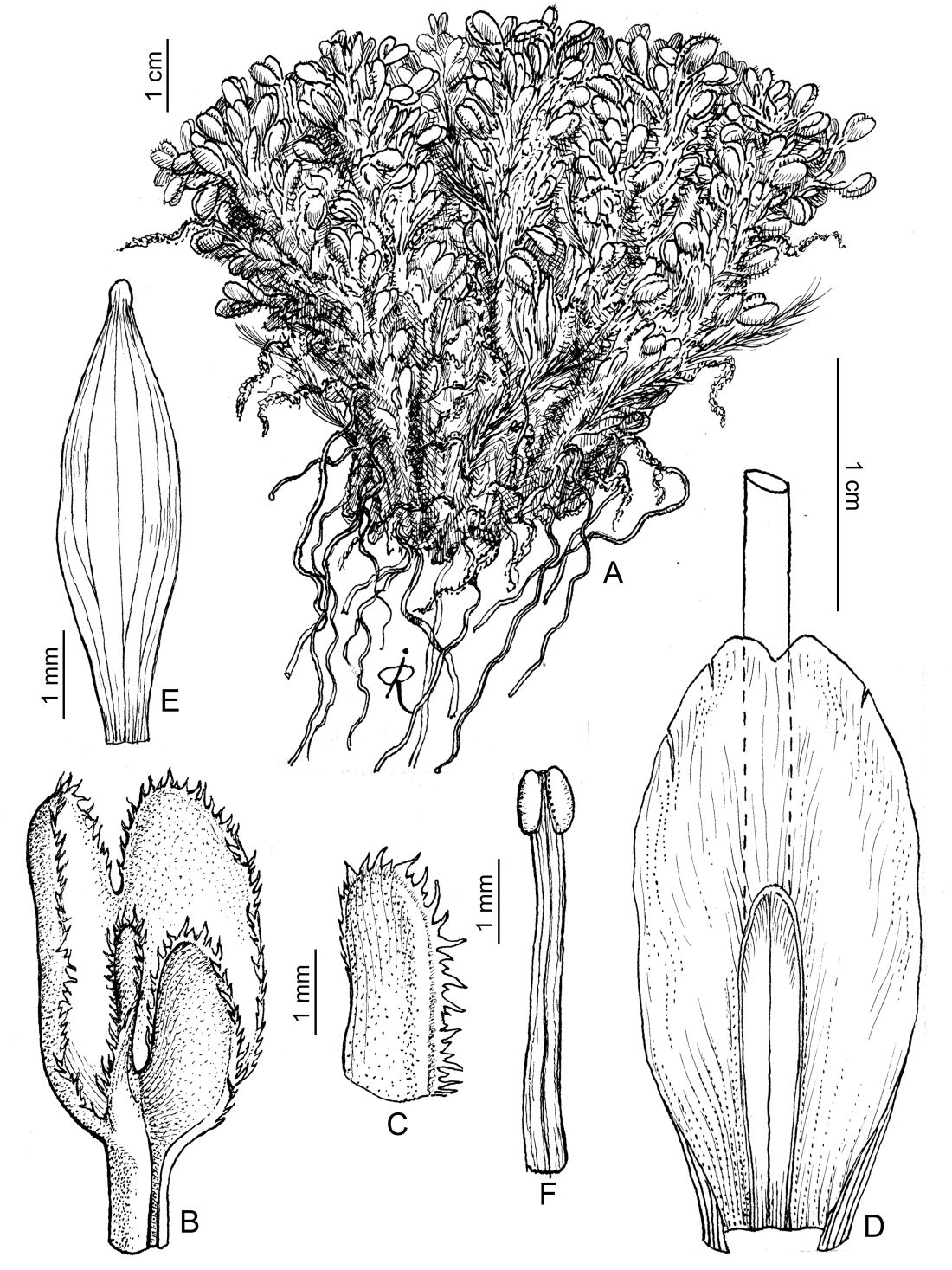 Plantas hasta de 3 cm de alto; tallos cortos, ramificados. Hojas numerosas muy apretadas; pecíolos hasta de 9 mm de largo, gruesos, acanalados; vaina estipular tan larga como el pecíolo, amplexicaule, escariosa, connada al pecíolo hasta cerca de la mitad, 2-lobulada; lámina ovada a suborbicular, de 2,5-6,5 × 2,5-4 mm, ciliada, gruesa, emarginada, que forma 2 lóbulos que se pliegan sobre el nervio medio, encerrando 2 apéndices obtusos que nacen en la base, adpresos, semiovoides o de contono oblongo, asimétricos, todos los bordes hialinos y ciliados, crenados o dentados; pedúnculos ca. 4 mm de largo, cubiertos por las hojas; sépalos petaloideos oblongos, linear-subespatulados o espatulados, de 3,5-6 × 1,5-2 mm, gruesos, bordes escariosos; ápice obtuso o con una lengüeta apical, escariosa; estambres 6-9, algo desiguales, de 3,5-5 mm de largo;anteras de contorno oblongo; carpelos 2-5, ovoides, aplanados, algo asimétricos, óvulos 6.