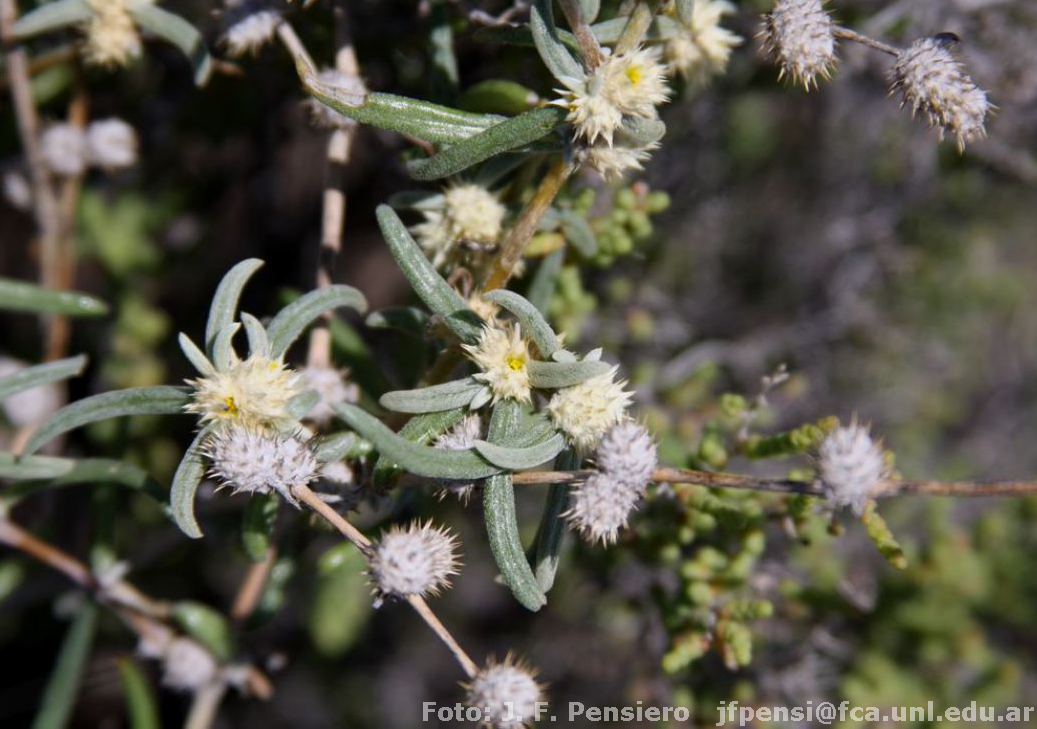 Arbustos o sufrútices de 10-30 cm de alto; tallos muy ramificados, con abundantes pelos blanquecinos, ramificados. Hojas con pseudopecíolos breves; láminas lineares, de 0,7-5,5 × 0,1-0,4 cm, agudas, enteras, brevemente mucronadas, crasas, con abundantes pelos, principalmente cuando jóvenes. Inflorescencias terminales o axilares, solitarias o en fascículos de 2-3, espiciformes, globosas, de 6-10 mm de diámetro, sésiles; brácteas y bractéolas ovadas, de 2,5-4 × 1-1,3 mm, acuminadas, las brácteas con un mucrón punzante ca. 1 mm, cartilaginosas, con márgenes escariosos, con abundantes pelos escabrosos, las bractéolas un poco más breves y angostas, con mucrón menor. Flores con 5 sépalos desiguales: los 2 externos ovados, de 3-5 × 0,9-1,2 mm, agudos, terminados en una espina punzante de 0,5-2 mm de largo, cartilagíneos, 3-nervados, con pelos armados; el sépalo intermedio ovado, de 2,5-3 × 0,9 mm, mucronado; los 2 sépalos interiores, oblongos, de 1,2-2,2 mm de largo, escariosos, aquillados; estambres 5, pseudoestaminodios más breves que los filamentos, laciniados, anteras de 0,8 mm de largo; ovario turbinado, de 0,8-1 × 0,8 mm, estilo de 0,3 mm de largo, estigma capitado. Frutos obovoides, algo truncados arriba, de 1,8 × 1,2 mm, membranáceos. Semillas lenticulares, de 0,8-1,1 mm de diámetro, de color pardo, brillantes.