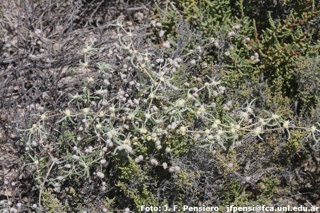 Arbustos o sufrútices de 10-30 cm de alto; tallos muy ramificados, con abundantes pelos blanquecinos, ramificados. Hojas con pseudopecíolos breves; láminas lineares, de 0,7-5,5 × 0,1-0,4 cm, agudas, enteras, brevemente mucronadas, crasas, con abundantes pelos, principalmente cuando jóvenes. Inflorescencias terminales o axilares, solitarias o en fascículos de 2-3, espiciformes, globosas, de 6-10 mm de diámetro, sésiles; brácteas y bractéolas ovadas, de 2,5-4 × 1-1,3 mm, acuminadas, las brácteas con un mucrón punzante ca. 1 mm, cartilaginosas, con márgenes escariosos, con abundantes pelos escabrosos, las bractéolas un poco más breves y angostas, con mucrón menor. Flores con 5 sépalos desiguales: los 2 externos ovados, de 3-5 × 0,9-1,2 mm, agudos, terminados en una espina punzante de 0,5-2 mm de largo, cartilagíneos, 3-nervados, con pelos armados; el sépalo intermedio ovado, de 2,5-3 × 0,9 mm, mucronado; los 2 sépalos interiores, oblongos, de 1,2-2,2 mm de largo, escariosos, aquillados; estambres 5, pseudoestaminodios más breves que los filamentos, laciniados, anteras de 0,8 mm de largo; ovario turbinado, de 0,8-1 × 0,8 mm, estilo de 0,3 mm de largo, estigma capitado. Frutos obovoides, algo truncados arriba, de 1,8 × 1,2 mm, membranáceos. Semillas lenticulares, de 0,8-1,1 mm de diámetro, de color pardo, brillantes.