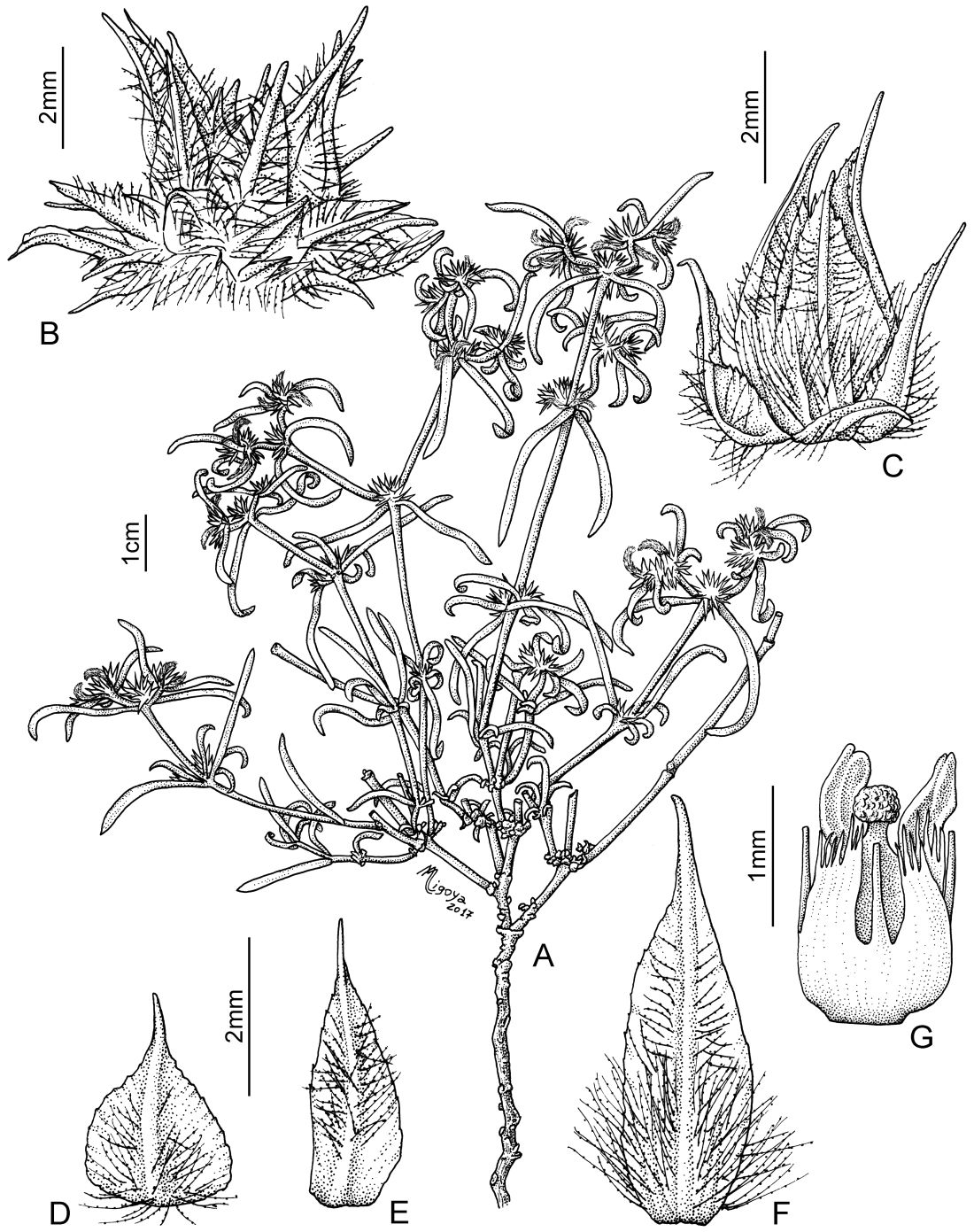 Arbustos o sufrútices de 10-30 cm de alto; tallos muy ramificados, con abundantes pelos blanquecinos, ramificados. Hojas con pseudopecíolos breves; láminas lineares, de 0,7-5,5 × 0,1-0,4 cm, agudas, enteras, brevemente mucronadas, crasas, con abundantes pelos, principalmente cuando jóvenes. Inflorescencias terminales o axilares, solitarias o en fascículos de 2-3, espiciformes, globosas, de 6-10 mm de diámetro, sésiles; brácteas y bractéolas ovadas, de 2,5-4 × 1-1,3 mm, acuminadas, las brácteas con un mucrón punzante ca. 1 mm, cartilaginosas, con márgenes escariosos, con abundantes pelos escabrosos, las bractéolas un poco más breves y angostas, con mucrón menor. Flores con 5 sépalos desiguales: los 2 externos ovados, de 3-5 × 0,9-1,2 mm, agudos, terminados en una espina punzante de 0,5-2 mm de largo, cartilagíneos, 3-nervados, con pelos armados; el sépalo intermedio ovado, de 2,5-3 × 0,9 mm, mucronado; los 2 sépalos interiores, oblongos, de 1,2-2,2 mm de largo, escariosos, aquillados; estambres 5, pseudoestaminodios más breves que los filamentos, laciniados, anteras de 0,8 mm de largo; ovario turbinado, de 0,8-1 × 0,8 mm, estilo de 0,3 mm de largo, estigma capitado. Frutos obovoides, algo truncados arriba, de 1,8 × 1,2 mm, membranáceos. Semillas lenticulares, de 0,8-1,1 mm de diámetro, de color pardo, brillantes.