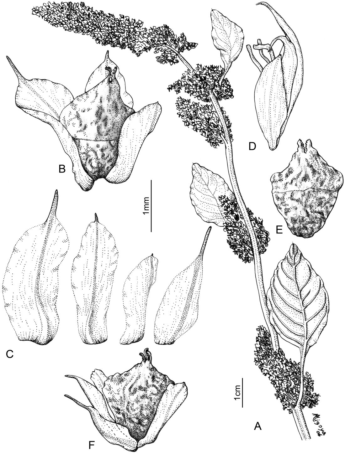 A. Hábito fértil. B. Flor pistilada. C. Sépalos y bráctea de la flor pistilada. D. Flor estaminada. E. Fruto. Amaranthus asplundii subsp. australis. F. Flor pistilada.