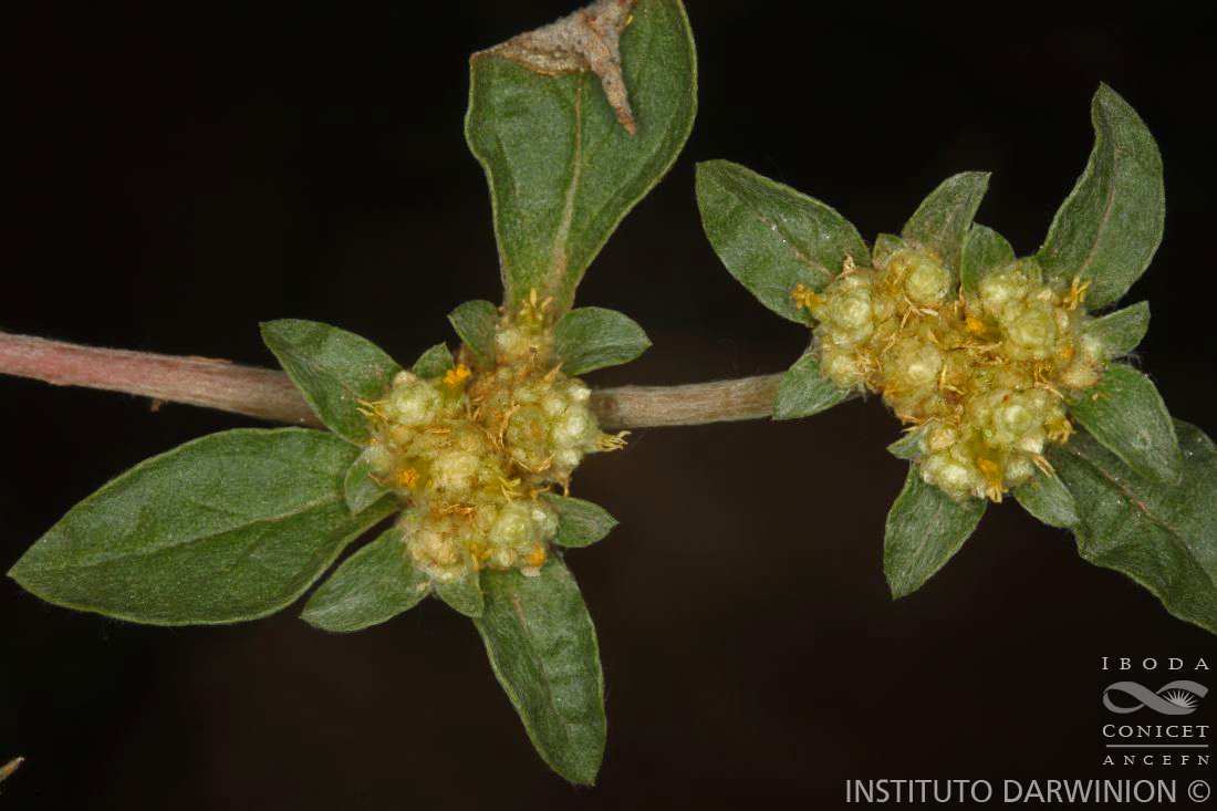 Sufrutice, raíz axonomorfa profunda; tallo principal reducido a un braquiblasto con hojas rosuladas, de 2,5-6,5 cm de largo, pecíolo ? - ½ del largo de la hoja; láminas elípticas a lanceoladas, de 1-2 cm de ancho, agudas, de cuyas axilas nacen las ramificaciones plagiótropas floríferas. Tallos floríferos muy ramificados, hasta de 50 cm de largo, con 1-3 nudos vegetativos cercanos al tallo principal y los restantes reproductivos, terminando cada ramificación en una espiga o cabezuela de espigas terminales, sésiles, entre 2 brácteas foliáceas, de cuyas axilas nacen ramificaciones ulteriores. Hojas de las ramificaciones con pecíolo breve, ovadas, de 1-3,5 × 0,5-2 cm, a menudo asimétricas, agudas o brevemente acuminadas, tomentosas en ambas caras. Inflorescencias en espigas 10-80 o más floras, a menudo reunidas en cabezuelas aplanadas hasta de 2,5 cm de diámetro, frecuentemente de apariencia axilar, por el crecimiento de una de las ramas que nacen en la axila de las 2 brácteas foliáceas, o bien sentadas en bifurcaciones del tallo florífero, por desarrollo de sendas ramas a partir de las yemas de las 2 brácteas foliáceas; bráctea floral de 0,15-0,3 cm de largo, obovado orbicular, generalmente ± pilosa en el dorso; bractéolas de 0,2-0,4 cm de largo, ovadas u oblongas, falcadas, obtusas o subagudas, generalmente glabras. Flores con sépalos subiguales, connados en la base, de 0,3-0,45 cm de largo, alargado-espatulados, más bien obtusos, 3-nervados, dorso con indumento lanoso de color castaño; estambres del largo del perianto, o un poco más largos, con anteras de 0,7-1,5 mm de largo, filamentos soldados en aprox. las ? partes inferiores, parte libre superior algo angostada hacia arriba, no lobada, uniones entre filamentos libres sin apéndices interestaminales, generalmente anchos y redondeados. Ovario angostamente ovoide, con estilo poco diferenciado y estigma 2-partido, de 0,5-1 mm de largo. Fruto angostamente ovoide, hasta de 2 mm de largo, sin el estilo persistente, atenuado hacia el ápice. Var. tomentosa.- Inflorescencia con 20 a 80 o más flores; epifilo velloso, con tricomas flexuosos entrelazados y con forma de látigo.