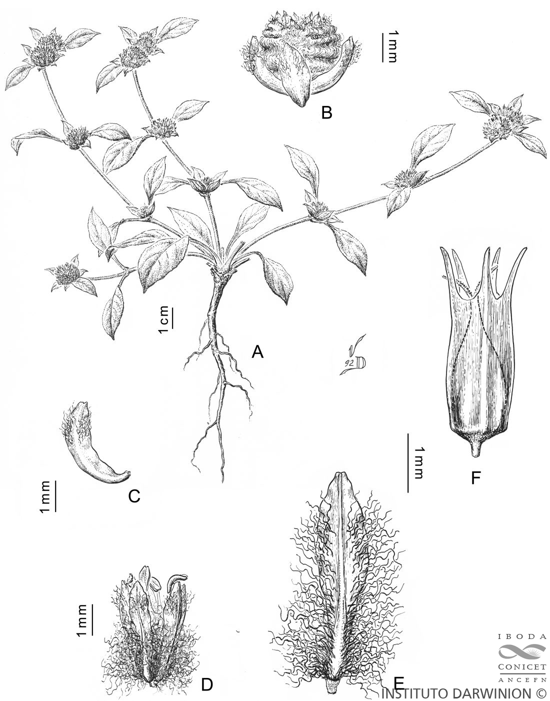Sufrutice, raíz axonomorfa profunda; tallo principal reducido a un braquiblasto con hojas rosuladas, de 2,5-6,5 cm de largo, pecíolo ? - ½ del largo de la hoja; láminas elípticas a lanceoladas, de 1-2 cm de ancho, agudas, de cuyas axilas nacen las ramificaciones plagiótropas floríferas. Tallos floríferos muy ramificados, hasta de 50 cm de largo, con 1-3 nudos vegetativos cercanos al tallo principal y los restantes reproductivos, terminando cada ramificación en una espiga o cabezuela de espigas terminales, sésiles, entre 2 brácteas foliáceas, de cuyas axilas nacen ramificaciones ulteriores. Hojas de las ramificaciones con pecíolo breve, ovadas, de 1-3,5 × 0,5-2 cm, a menudo asimétricas, agudas o brevemente acuminadas, tomentosas en ambas caras. Inflorescencias en espigas 10-80 o más floras, a menudo reunidas en cabezuelas aplanadas hasta de 2,5 cm de diámetro, frecuentemente de apariencia axilar, por el crecimiento de una de las ramas que nacen en la axila de las 2 brácteas foliáceas, o bien sentadas en bifurcaciones del tallo florífero, por desarrollo de sendas ramas a partir de las yemas de las 2 brácteas foliáceas; bráctea floral de 0,15-0,3 cm de largo, obovado orbicular, generalmente ± pilosa en el dorso; bractéolas de 0,2-0,4 cm de largo, ovadas u oblongas, falcadas, obtusas o subagudas, generalmente glabras. Flores con sépalos subiguales, connados en la base, de 0,3-0,45 cm de largo, alargado-espatulados, más bien obtusos, 3-nervados, dorso con indumento lanoso de color castaño; estambres del largo del perianto, o un poco más largos, con anteras de 0,7-1,5 mm de largo, filamentos soldados en aprox. las ? partes inferiores, parte libre superior algo angostada hacia arriba, no lobada, uniones entre filamentos libres sin apéndices interestaminales, generalmente anchos y redondeados. Ovario angostamente ovoide, con estilo poco diferenciado y estigma 2-partido, de 0,5-1 mm de largo. Fruto angostamente ovoide, hasta de 2 mm de largo, sin el estilo persistente, atenuado hacia el ápice. Var. tomentosa.- Inflorescencia con 20 a 80 o más flores; epifilo velloso, con tricomas flexuosos entrelazados y con forma de látigo.