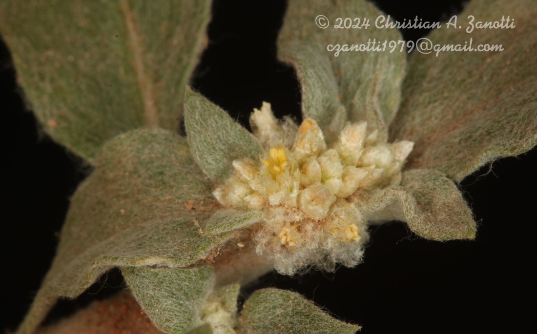 Sufrutice, raíz axonomorfa profunda; tallo principal reducido a un braquiblasto con hojas rosuladas, de 2,5-6,5 cm de largo, pecíolo ? - ½ del largo de la hoja; láminas elípticas a lanceoladas, de 1-2 cm de ancho, agudas, de cuyas axilas nacen las ramificaciones plagiótropas floríferas. Tallos floríferos muy ramificados, hasta de 50 cm de largo, con 1-3 nudos vegetativos cercanos al tallo principal y los restantes reproductivos, terminando cada ramificación en una espiga o cabezuela de espigas terminales, sésiles, entre 2 brácteas foliáceas, de cuyas axilas nacen ramificaciones ulteriores. Hojas de las ramificaciones con pecíolo breve, ovadas, de 1-3,5 × 0,5-2 cm, a menudo asimétricas, agudas o brevemente acuminadas, tomentosas en ambas caras. Inflorescencias en espigas 10-80 o más floras, a menudo reunidas en cabezuelas aplanadas hasta de 2,5 cm de diámetro, frecuentemente de apariencia axilar, por el crecimiento de una de las ramas que nacen en la axila de las 2 brácteas foliáceas, o bien sentadas en bifurcaciones del tallo florífero, por desarrollo de sendas ramas a partir de las yemas de las 2 brácteas foliáceas; bráctea floral de 0,15-0,3 cm de largo, obovado orbicular, generalmente ± pilosa en el dorso; bractéolas de 0,2-0,4 cm de largo, ovadas u oblongas, falcadas, obtusas o subagudas, generalmente glabras. Flores con sépalos subiguales, connados en la base, de 0,3-0,45 cm de largo, alargado-espatulados, más bien obtusos, 3-nervados, dorso con indumento lanoso de color castaño; estambres del largo del perianto, o un poco más largos, con anteras de 0,7-1,5 mm de largo, filamentos soldados en aprox. las ? partes inferiores, parte libre superior algo angostada hacia arriba, no lobada, uniones entre filamentos libres sin apéndices interestaminales, generalmente anchos y redondeados. Ovario angostamente ovoide, con estilo poco diferenciado y estigma 2-partido, de 0,5-1 mm de largo. Fruto angostamente ovoide, hasta de 2 mm de largo, sin el estilo persistente, atenuado hacia el ápice. Var. tomentosa.- Inflorescencia con 20 a 80 o más flores; epifilo velloso, con tricomas flexuosos entrelazados y con forma de látigo.