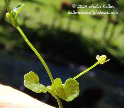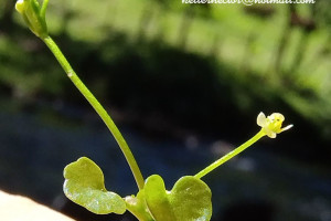 Hierbas estoloníferas, semisumergidas, glabras; tallos delgados hasta de 50 cm de alto, radicantes. Hojas con pecíolos hasta de 5 cm de largo; vaina estipular con 2 aurículas agudas, pequeñas; lámina entera, ovada a suborbicular, raramente reniforme, de 5-18 × 5-25 mm, base cordada o truncada, obtusa o subaguda, margen crenado. Flores solitarias, pedunculadas, opuestas a las hojas; brácteas ovadas o sublineares, obtusas o 2-auriculadas, bordes escariosos; sépalos 3-4, obovados, de 1,5-2,3 × 1-1,3 mm , verdosos o blanquecinos, glabros; pétalos 3-4, obovado-elípticos a oblongo-espatulados, de 1-2 × 0,5-1,3 mm, amarillentos o blanquecinos, glabros; escama nectarífera cerca de la base; estambres (4-)6-9, fi lamentos algo curvos; carpelos 13-30, semiovoideos, comprimidos, asimétricos, atenuados en estilo curvo o en espiral; receptáculo esférico, casi nulo. Frutos aquenios ovoides, de 0,7-1,4 mm de diámetro, asimétricos, levemente aristados, cortamente apiculados y finamente foveolados.