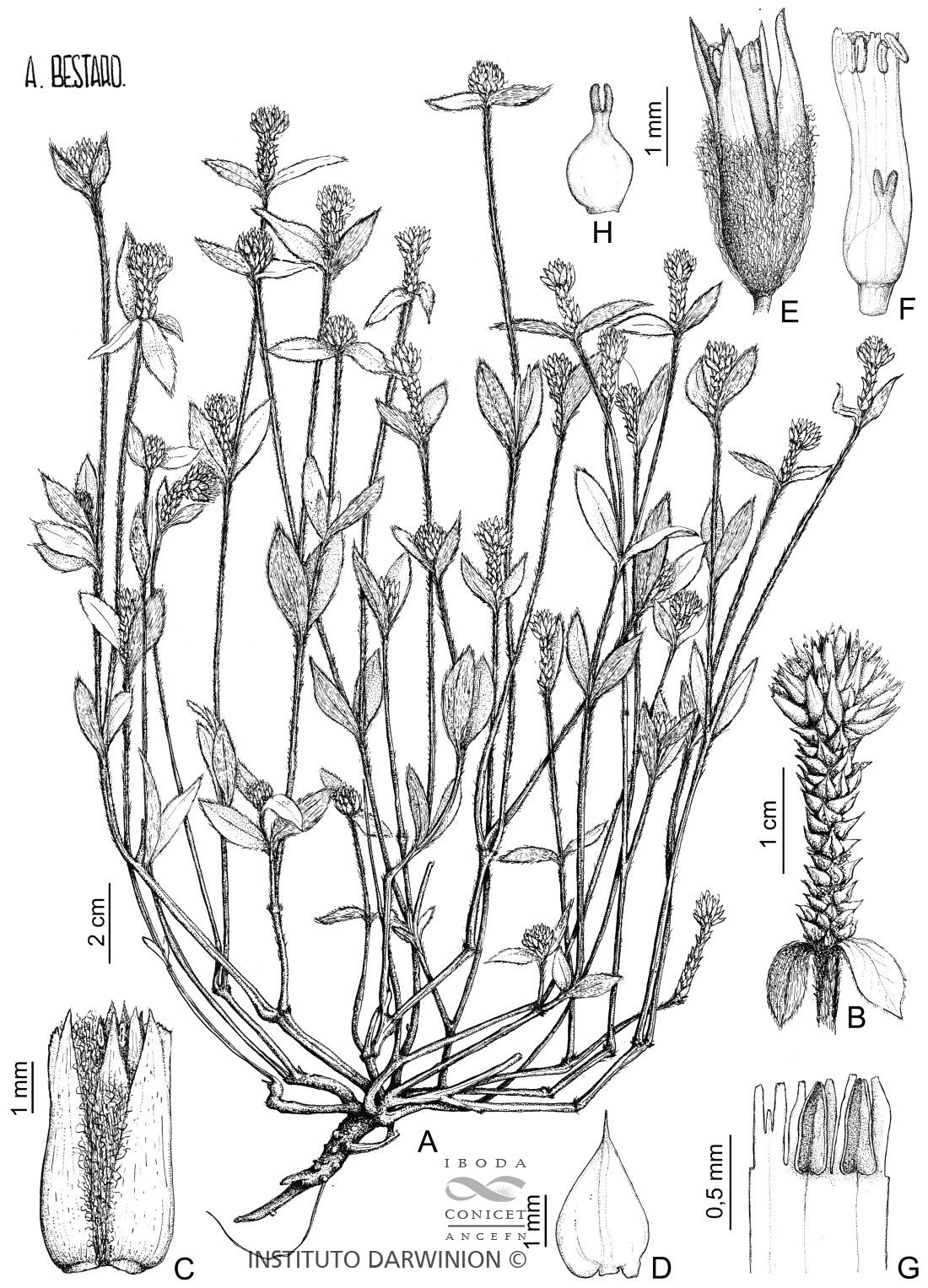 Hierba perenne, decumbente, cuyas ramificaciones plagiótropas poseen su extremo distal algo erecto, alcanzando unos 10-30 cm de alto; raíz pivotante, frecuentemente engrosada cerca del cuello; tallo más o menos pubescente, con tricomas adpresos, más abundantes en tallos jóvenes. Hojas membranáceas, opuestas, elípticas hasta espatuladas, con pecíolos hasta de 4 cm de largo, agudas u obtusas, mucronadas, de base cuneada, pilosas, glabrescentes en la haz. Inflorescencias en espigas cilindricas a obovadas, solitarias, terminales, con involucro de 2 brácteas foliáceas, elíptico-lanceoladas, alargándose la inflorescencia a la madurez, el raquis primario alcanzado entonces de 2-5 cm de largo; bráctea floral ca. 0,25 cm de largo, anchamente ovada o deltoide, acuminada, glabra, persistente; bractéolas de 0,45-0,55 cm de largo, naviculares, agudas, con una cresta angosta, dentada o aserrada en la mitad superior del dorso, glabras, caedizas junto con el fruto a la madurez. Flores basales caducas a la madurez, mucho antes de la apertura de las apicales; sépalos blanquecino-grisáceos, a veces rosados o dorados, apenas tan largos como las bractéolas, desiguales; los 3 exteriores escariosos, angostamente oblongos, agudos, los 2 interiores cartilagíneos a la madurez, alargado-lanceolados, agudos; todos los sépalos 1-nervados, lanosos en el dorso, los exteriores en la porción basal, los interiores en los 2/3 inferiores. Estambres tan largos como los sépalos, tubo estaminal formado por los filamentos soldados en casi toda su extensión, parte libre superior del tubo estaminal 3-lobada, lóbulo central anterífero subnulo, lóbulos laterales alargados, casi alcanzando el ápice de las anteras. Ovario ovoide, de 0,5 mm de largo, con estilo breve y estigma bífido. Fruto utrículo ca. 2 mm de largo, sin el estilo persistente, encerrado por los sépalos endurecidos y cayendo con éstos. Semilla de 1,8 mm de largo, algo comprimida, de color parduzco.