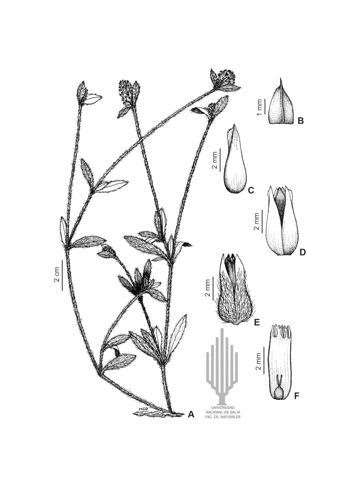 Hierba perenne, decumbente, cuyas ramificaciones plagiótropas poseen su extremo distal algo erecto, alcanzando unos 10-30 cm de alto; raíz pivotante, frecuentemente engrosada cerca del cuello; tallo más o menos pubescente, con tricomas adpresos, más abundantes en tallos jóvenes. Hojas membranáceas, opuestas, elípticas hasta espatuladas, con pecíolos hasta de 4 cm de largo, agudas u obtusas, mucronadas, de base cuneada, pilosas, glabrescentes en la haz. Inflorescencias en espigas cilindricas a obovadas, solitarias, terminales, con involucro de 2 brácteas foliáceas, elíptico-lanceoladas, alargándose la inflorescencia a la madurez, el raquis primario alcanzado entonces de 2-5 cm de largo; bráctea floral ca. 0,25 cm de largo, anchamente ovada o deltoide, acuminada, glabra, persistente; bractéolas de 0,45-0,55 cm de largo, naviculares, agudas, con una cresta angosta, dentada o aserrada en la mitad superior del dorso, glabras, caedizas junto con el fruto a la madurez. Flores basales caducas a la madurez, mucho antes de la apertura de las apicales; sépalos blanquecino-grisáceos, a veces rosados o dorados, apenas tan largos como las bractéolas, desiguales; los 3 exteriores escariosos, angostamente oblongos, agudos, los 2 interiores cartilagíneos a la madurez, alargado-lanceolados, agudos; todos los sépalos 1-nervados, lanosos en el dorso, los exteriores en la porción basal, los interiores en los 2/3 inferiores. Estambres tan largos como los sépalos, tubo estaminal formado por los filamentos soldados en casi toda su extensión, parte libre superior del tubo estaminal 3-lobada, lóbulo central anterífero subnulo, lóbulos laterales alargados, casi alcanzando el ápice de las anteras. Ovario ovoide, de 0,5 mm de largo, con estilo breve y estigma bífido. Fruto utrículo ca. 2 mm de largo, sin el estilo persistente, encerrado por los sépalos endurecidos y cayendo con éstos. Semilla de 1,8 mm de largo, algo comprimida, de color parduzco.