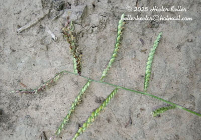 Observaciones: Se ubica en el grupo Eriantha (Zuloaga & Morrone, 2005), dentro del cual es afín a Paspalum erianthum; se distingue de ésta por poseer la base rizomatosa, con rizomas viajeros, horizontales, arqueados, cubiertos por catáfilos seríceos, hojas dispuestas en la base rodeadas de catáfilos, inflorescencias con pocos racimos, 2-4, y antecio superior 0,6-1 mm más corto que la gluma superior y la lemma inferior.