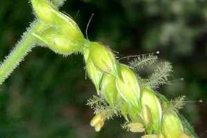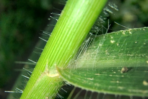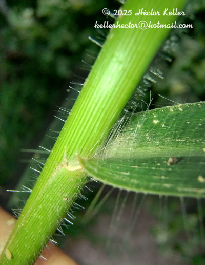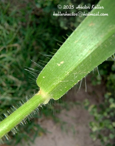Plantas perennes, rizomatosas, con rizomas horizontales, viajeros, cubiertos de catáfilos seríceos, con pelos blanquecinos; cañas de 40-100 cm x 2-3 mm, erectas, paucinodes; entrenudos 2-5, de 7-25 cm de largo, cilíndricos, huecos, glabros; nudos comprimidos, castaños, glabros a pilosos; vainas predominantemente basales, superpuestas, las basales de 1-3 cm de largo, densamente hirsutas, rodeadas de catáfilas en la base, áfilas en la base, las de las cañas floríferas de 5-15 cm de largo, hirsutas en la porción distal, luego glabras, los márgenes pestañosos; lígulas de 0,5-1,4 mm de largo, membranáceas, de ápice lacerado, glabras; cuello glabro, castaño; láminas lineares, de 6-15 cm x 3-6 mm, reducidas hacia el ápice de las cañas, predominantemente basales, rígidas, planas, glabrescentes a densamente papiloso-pilosas en ambas caras, con pelos cortos, de base redondeada a subcordada y ápice agudo a subulado, los márgenes escabriúsculos, largamente pestañosos, con pelos tuberculados, blanquecinos, hasta de 6 mm de largo. Inflorescencias terminales de 6-10 x 2-4 cm; pedúnculos largamente exertos, hasta de 30 cm de largo, cilíndricos, glabros; eje principal de 1-5 cm de largo, aplanado, glabro, escabriúsculo a liso; pulvínulos largamente pilosos; racimos 2-4, alternos, ascendentes, distantes entre sí, adpresos a ligeramente divergentes del raquis, terminando en una espiguilla desarrollada; raquis de los racimos de 2-6 cm x 1-1,3 mm, aplanado, glabro, verdoso a violáceo, con los márgenes glabros, escabriúsculos; pedicelos en pares, desiguales, hasta de 1,6 mm de largo, escabriúsculos a pilosos, con pelos blanquecinos en los márgenes; espiguillas en pares, en ocasiones la inferior abortada, dispuestas en 4 series. Espiguillas largamente elipsoides, de 3,6-5 x 1,2-1,8 mm, de ápice agudo, plano-convexas, papiloso-pilosas, plateadas; gluma superior y lemma inferior subiguales, membranáceas, con los márgenes y la base largamente pilosos, con pelos blanquecinos hasta de 3 mm de largo, la gluma con la región media cubierta por pelos y la lemma con la región media pubescente; gluma inferior ausente; gluma superior tan larga como la espiguilla, 5-nervia, con un nervio central y los restantes marginales; lemma inferior glumiforme, poco menor que la gluma superior, 3-nervia; pálea y flor inferior ausentes; antecio superior elipsoide, de 3-4 x 1-1,2 mm, cartilaginoso, finamente papiloso, pajizo, glabro, 0,6-1 mm más corto que la gluma superior y lemma inferior; lemma con papilas distribuidas regularmente, macropelos y micropelos bicelulares hacia el ápice, los márgenes enrollados sobre la pálea, 5-nervia; pálea de similar textura que la lemma, con papilas regularmente distribuidas y micropelos hacia los márgenes y el ápice; lodículas 2, ca. 0,3 mm de largo; estambres 3, anteras de 2,4-3 mm de largo, amarillentas; cariopsis elipsoide, de 2,4 x 1 mm; hilo elíptico, ? del largo de la cariopsis; embrión ? del largo de la cariopsis.