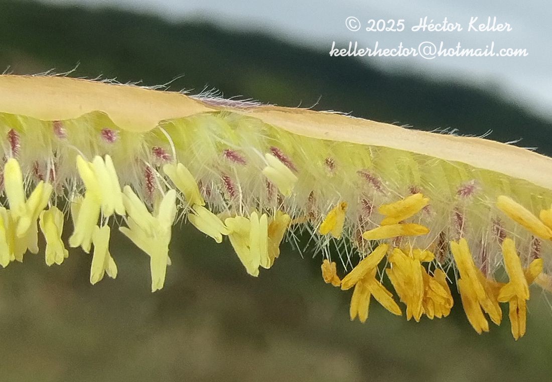 Plantas perennes, cespitosas, cortamente rizomatosas, con catáfilos densamente pilosos; cañas de 25-100 cm x 1-2 mm, simples, erectas a geniculadas, fasciculadas en la base; entrenudos de 3-18 cm de largo, cilíndricos, huecos, glabros; nudos 3-6, castaños, glabros a cortamente pilosos; vainas de 4-8 cm de largo, estriadas, glabras a hirsutas, con pelos tuberculados, caducos, los márgenes membranáceos; vainas basales superpuestas; lígulas membranáceas, breves, de 0,2 mm de largo, castañas, glabras; pseudolígula presente, formada por un mechón de pelos cortos entremezclados con pelos largos hasta de 0,5 mm de largo; cuello glabro; láminas filiformes, de 8-27 cm x 1-3 mm, ascendentes, erectas, rígidas, involutas, predominantemente basales, esparcidamente papiloso-hirsutas, con pelos largos, tuberculados, en ambas caras o sólo en la cara adaxial, de base angostada, continuándose imperceptiblemente con la vaina y ápice largamente agudo, los márgenes basales largamente pestañosos. Inflorescencias terminales exertas; pedúnculos largamente exertos, hasta de 25 cm de largo, cortamente glabros a hirsutos; eje principal no desarrollado; pulvínulos cortamente pilosos, con (1-)2 brácteas papiráceas en su base; racimo 1, raro 2, falcado; raquis de los racimos anchamente foliáceo, de 2-15 cm x (4-)5-10 mm, glabro en ambas caras a cortamente hispídulo hacia la cara adaxial, cara adaxial con nervio medio manifiesto, verde a violáceo, los márgenes membranáceos, hialinos, castaño claro a dorados, planos a plegados, cubriendo a la espiguillas y terminando en una prolongación estéril; pedicelos breves, de 0,1-0,2 mm de largo, cortamente hirsutos, con pelos radiados hacia el ápice; espiguillas solitarias, dispuestas en 2 series. Espiguillas obovoides a elipsoides, de 2,4-3,9 x 1,2-1,6 mm, plano-convexas, de ápice agudo, pajizas o con tintes violáceos hacia el ápice o en toda la superficie, vilosas, con los márgenes largamente pestañosos, los superiores papilosos, con pelos blanquecinos, papiloso-sedosos, hasta de 4 mm de largo, con un mechón de pelos hacia la base, el resto glabro; gluma superior y lemma inferior subiguales, tan largas como la espiguilla, membranáceo-hialinas, los márgenes rígidos; gluma inferior ausente; gluma superior de 2,4-3,9 mm de largo, 2(-3)nervia, con los nervios próximos a los márgenes, el nervio central tenue o ausente; lemma inferior glumiforme, 2-nervia, con los nervios próximos a los márgenes; pálea y flor inferior ausentes; antecio superior angostamente obovoide a elipsoide, de 1,8-2,9 x 0,8-1 mm, 0,4-1 mm más corto que la gluma superior y la lemma inferior, cartáceo, pálido, liso, glabro, cortamente estipitado, abierto en su extremo superior, fácilmente caedizo a la madurez sin las brácteas; lodículas 2, de 0,2 mm de largo; estambres 3, anteras de 1,8-2 mm de largo; cariopsis obovoide, de 1,6 x 0,8 mm; hilo elíptico; embrión ½ o menos del largo de la cariopsis.