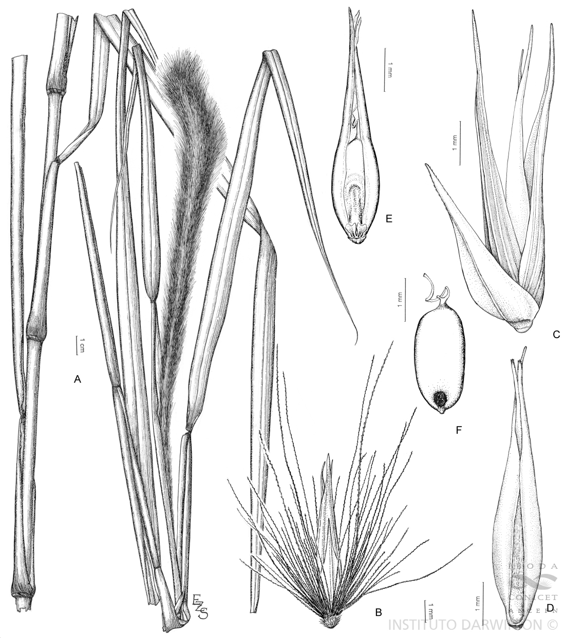 Plantas perennes, cespitosas, robustas; cañas herbáceas, de canal medular reducido, ramificadas y decumbentes en la base de 1,2-2,5(-3) m de alto y 5-9 mm de diámetro, entrenudos cilíndricos, estriados o longitudinalmente acanalados y glabros, nudos engrosados, glabros; vainas ligeramente aquilladas hacia el ápice, glabras o pilosas, sin yema en su axila; lígulas pestañosas, formadas por un anillo de pelos cortos de 1-1,5 mm de largo; láminas planas, angostamente lanceoladas, de 18-30 x (0,6-)0,8-1,3(-1,5) cm, glabras o escabrosas, de base ancha, a veces redondeada y ápice agudo-acuminado, nervio medio sólo conspicuo en el tercio inferior, próximo a la región ligular. Inflorescencia en panoja espiciforme terminal, solitaria en el eje floral, alargada, densa, exerta, pajiza o purpúrea, generalmente flexuosa a la madurez (formando una "S" en la porción media), de 10-25 x 2-3 cm considerando las setas (1-2 cm de ancho excluyendo las setas); pedúnculos cilíndricos, filiformes, hasta de 9 cm de largo, exertos, rectos o algo curvos; raquis de la panoja cilíndrico, a veces estriado, flexuoso, densamente puberulento, no dispuesto en zig-zag; involucro formado por 20-45 setas lineal-escabrosas, con dentículos antrorsos, rígidas, desiguales en largo (menores, iguales y mayores que la espiguilla), de 4-16 mm de largo, sin una seta marcadamente más larga que las restantes. Espiguillas lanceoladas, solitarias por involucro, de 5-7 x 1-1,2 mm, sésiles a cortamente pediceladas, glabras, 2-floras, con el antecio inferior neutro y el superior perfecto, base de la espiguilla hirsuta o con anillo de pelos; gluma inferior membranácea, de 2-3 mm de largo, generalmente 1-nervia, aguda a subaguda; gluma superior membranácea, de 5-7 mm de largo, 7-9-nervia, acuminada o aguda en el ápice; lemma inferior lanceolada, de 5-7 x 1-1,3 mm, 7-9-nervia, de ápice agudo; pálea inferior ausente; lemma superior papirácea, subulada, de 5-6,5 x 1-1,3 mm, 5-nervia, las nervaduras poco visibles de ápice agudo; pálea superior levemente menor que la lemma, de (4,5-)5-6 mm de largo; estambres 3, anteras de 1,5-2 mm de largo, de ápice glabro, con los filamentos estaminales rara vez exertos; gineceo con las ramas estigmáticas poco exertas, de 2-2,5 mm de largo, estilos apenas soldados en la base; cariopsis globosa, de 1,5-2 mm de largo.