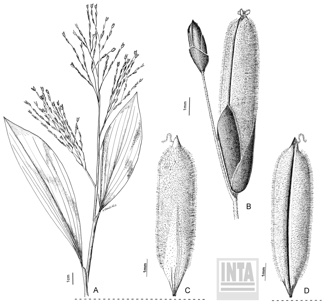 Hierba perenne de 30-80 cm de altura, rizomatosa, césped abundante hasta cerca de las inflorescencias; cañas simples, erectas o geniculadas en la base, plurinodes, nudos glabros; vainas glabras, más largas que los entrenudos; lígula de 1 mm de largo, membranácea, truncada, borde eroso; láminas de 4-15 x 2-5 cm, planas, lanceoladas o elípticas, con finas nervaduras transversales, glabras, escabriúsculas en el margen y envés, pseudopecioladas, pseudopecíolo de 0,5-2 mm de largo, retorcido, la torción de 180° en el ápice del mismo invirtiendo a la lámina. Inflorescencia de 12-20 x 4-8 cm, racemoso-paniculada, exerta, terminal, ramificaciones laterales terminando en una espiguilla estaminada desarrollada, generalmente quebradizas, rompiéndose y separándose de la planta, raquis subtrígono, pulvinado, cubierto de pelos uncinados no conspicuos; monoicas, con espiguillas dimorfas, 1-floras, la inferior femenina, sésil o subsésil y la superior masculina, pediceladas, a veces, pares de espiguillas femeninas o pares de espiguillas masculinas mezcladas en una misma inflorescencia o con predominancia de una de ellas. Espiguillas femeninas de 8,5 mm de largo, sésil o con pedicelo de ca. 1 mm de largo; glumas 2, lanceoladas, membranáceas, persistentes, castaño-purpúreas, glabras o escabriúsculas, la inferior de 4-5 mm de largo, 4-nervia, la superior de 3,5-4,5 mm de largo, 3-nervia; lemma de 7-10 mm de largo, subcilíndrica, con los márgenes involutos, ápice rostrado, cartilaginosa, 7-plurinerviada, cubierta de pelos uncinados, excepto el ápice, los márgenes y la parte media inferior del dorso que son escabriúsculos o glabros, castaña o amarillenta; pálea de 7,6 mm de ancho, linear, membranácea, binervada, bicarinada, con surco notable, pilosa, encerrada por la lemma; ovario de 1 mm de largo, estilo de ca. 7 mm de largo, enrrollado dentro del antecio y terminado en 3 ramas estigmáticas emergentes del mismo; lodículas 3, pequeñísimas; cariopsis de 5,5-7 x 0,8 mm, subcilíndrica, coronada por el resto del estilo seco, surco longitudinal profundo, encerrada en las glumelas y cayendo con ellas a la madurez; mácula embrional pequeña, basal; hilo linear; endosperma seco; espiguilla masculina de 2,5 mm de largo, pedicelada, pedicelo de 4-7 mm de ancho, adpreso al raquis, no desarticulándose, con pelos uncinados no conspicuos; glumas 2, lanceoladas, membranáceas, 1-nervias, castaño-purpúreas, la inferior de 1-1,5 mm de largo, la superior de 2-3 mm de largo, ovada, 3-nervia; lemma de 2,5 mm de largo, ovada, membranácea, 3-nervia, con venas transversales; pálea de casi igual longitud y consistencia que la lemma, 2-nervia, bidentada; androceo 6, anteras de 1-2,2 mm de largo.