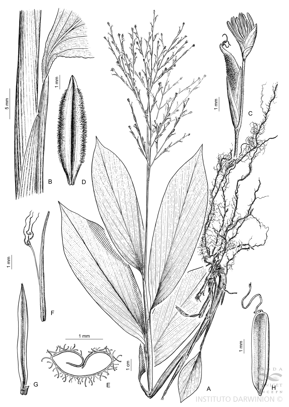Hierba perenne de 30-80 cm de altura, rizomatosa, césped abundante hasta cerca de las inflorescencias; cañas simples, erectas o geniculadas en la base, plurinodes, nudos glabros; vainas glabras, más largas que los entrenudos; lígula de 1 mm de largo, membranácea, truncada, borde eroso; láminas de 4-15 x 2-5 cm, planas, lanceoladas o elípticas, con finas nervaduras transversales, glabras, escabriúsculas en el margen y envés, pseudopecioladas, pseudopecíolo de 0,5-2 mm de largo, retorcido, la torción de 180° en el ápice del mismo invirtiendo a la lámina. Inflorescencia de 12-20 x 4-8 cm, racemoso-paniculada, exerta, terminal, ramificaciones laterales terminando en una espiguilla estaminada desarrollada, generalmente quebradizas, rompiéndose y separándose de la planta, raquis subtrígono, pulvinado, cubierto de pelos uncinados no conspicuos; monoicas, con espiguillas dimorfas, 1-floras, la inferior femenina, sésil o subsésil y la superior masculina, pediceladas, a veces, pares de espiguillas femeninas o pares de espiguillas masculinas mezcladas en una misma inflorescencia o con predominancia de una de ellas. Espiguillas femeninas de 8,5 mm de largo, sésil o con pedicelo de ca. 1 mm de largo; glumas 2, lanceoladas, membranáceas, persistentes, castaño-purpúreas, glabras o escabriúsculas, la inferior de 4-5 mm de largo, 4-nervia, la superior de 3,5-4,5 mm de largo, 3-nervia; lemma de 7-10 mm de largo, subcilíndrica, con los márgenes involutos, ápice rostrado, cartilaginosa, 7-plurinerviada, cubierta de pelos uncinados, excepto el ápice, los márgenes y la parte media inferior del dorso que son escabriúsculos o glabros, castaña o amarillenta; pálea de 7,6 mm de ancho, linear, membranácea, binervada, bicarinada, con surco notable, pilosa, encerrada por la lemma; ovario de 1 mm de largo, estilo de ca. 7 mm de largo, enrrollado dentro del antecio y terminado en 3 ramas estigmáticas emergentes del mismo; lodículas 3, pequeñísimas; cariopsis de 5,5-7 x 0,8 mm, subcilíndrica, coronada por el resto del estilo seco, surco longitudinal profundo, encerrada en las glumelas y cayendo con ellas a la madurez; mácula embrional pequeña, basal; hilo linear; endosperma seco; espiguilla masculina de 2,5 mm de largo, pedicelada, pedicelo de 4-7 mm de ancho, adpreso al raquis, no desarticulándose, con pelos uncinados no conspicuos; glumas 2, lanceoladas, membranáceas, 1-nervias, castaño-purpúreas, la inferior de 1-1,5 mm de largo, la superior de 2-3 mm de largo, ovada, 3-nervia; lemma de 2,5 mm de largo, ovada, membranácea, 3-nervia, con venas transversales; pálea de casi igual longitud y consistencia que la lemma, 2-nervia, bidentada; androceo 6, anteras de 1-2,2 mm de largo.