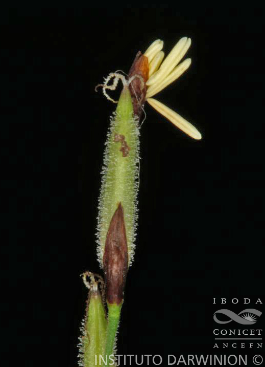 Hierba perenne de 30-80 cm de altura, rizomatosa, césped abundante hasta cerca de las inflorescencias; cañas simples, erectas o geniculadas en la base, plurinodes, nudos glabros; vainas glabras, más largas que los entrenudos; lígula de 1 mm de largo, membranácea, truncada, borde eroso; láminas de 4-15 x 2-5 cm, planas, lanceoladas o elípticas, con finas nervaduras transversales, glabras, escabriúsculas en el margen y envés, pseudopecioladas, pseudopecíolo de 0,5-2 mm de largo, retorcido, la torción de 180° en el ápice del mismo invirtiendo a la lámina. Inflorescencia de 12-20 x 4-8 cm, racemoso-paniculada, exerta, terminal, ramificaciones laterales terminando en una espiguilla estaminada desarrollada, generalmente quebradizas, rompiéndose y separándose de la planta, raquis subtrígono, pulvinado, cubierto de pelos uncinados no conspicuos; monoicas, con espiguillas dimorfas, 1-floras, la inferior femenina, sésil o subsésil y la superior masculina, pediceladas, a veces, pares de espiguillas femeninas o pares de espiguillas masculinas mezcladas en una misma inflorescencia o con predominancia de una de ellas. Espiguillas femeninas de 8,5 mm de largo, sésil o con pedicelo de ca. 1 mm de largo; glumas 2, lanceoladas, membranáceas, persistentes, castaño-purpúreas, glabras o escabriúsculas, la inferior de 4-5 mm de largo, 4-nervia, la superior de 3,5-4,5 mm de largo, 3-nervia; lemma de 7-10 mm de largo, subcilíndrica, con los márgenes involutos, ápice rostrado, cartilaginosa, 7-plurinerviada, cubierta de pelos uncinados, excepto el ápice, los márgenes y la parte media inferior del dorso que son escabriúsculos o glabros, castaña o amarillenta; pálea de 7,6 mm de ancho, linear, membranácea, binervada, bicarinada, con surco notable, pilosa, encerrada por la lemma; ovario de 1 mm de largo, estilo de ca. 7 mm de largo, enrrollado dentro del antecio y terminado en 3 ramas estigmáticas emergentes del mismo; lodículas 3, pequeñísimas; cariopsis de 5,5-7 x 0,8 mm, subcilíndrica, coronada por el resto del estilo seco, surco longitudinal profundo, encerrada en las glumelas y cayendo con ellas a la madurez; mácula embrional pequeña, basal; hilo linear; endosperma seco; espiguilla masculina de 2,5 mm de largo, pedicelada, pedicelo de 4-7 mm de ancho, adpreso al raquis, no desarticulándose, con pelos uncinados no conspicuos; glumas 2, lanceoladas, membranáceas, 1-nervias, castaño-purpúreas, la inferior de 1-1,5 mm de largo, la superior de 2-3 mm de largo, ovada, 3-nervia; lemma de 2,5 mm de largo, ovada, membranácea, 3-nervia, con venas transversales; pálea de casi igual longitud y consistencia que la lemma, 2-nervia, bidentada; androceo 6, anteras de 1-2,2 mm de largo.