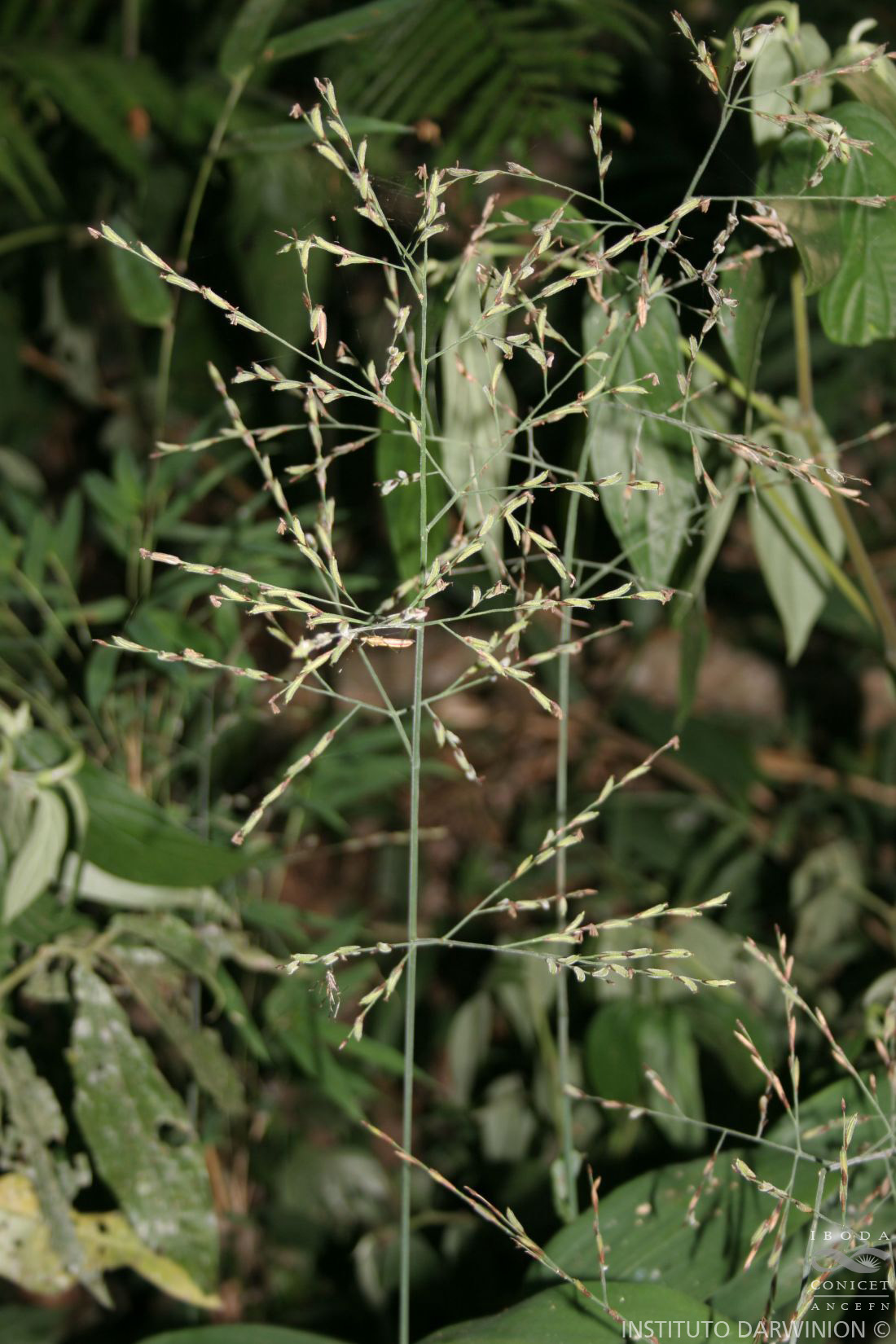 Hierba perenne de 30-80 cm de altura, rizomatosa, césped abundante hasta cerca de las inflorescencias; cañas simples, erectas o geniculadas en la base, plurinodes, nudos glabros; vainas glabras, más largas que los entrenudos; lígula de 1 mm de largo, membranácea, truncada, borde eroso; láminas de 4-15 x 2-5 cm, planas, lanceoladas o elípticas, con finas nervaduras transversales, glabras, escabriúsculas en el margen y envés, pseudopecioladas, pseudopecíolo de 0,5-2 mm de largo, retorcido, la torción de 180° en el ápice del mismo invirtiendo a la lámina. Inflorescencia de 12-20 x 4-8 cm, racemoso-paniculada, exerta, terminal, ramificaciones laterales terminando en una espiguilla estaminada desarrollada, generalmente quebradizas, rompiéndose y separándose de la planta, raquis subtrígono, pulvinado, cubierto de pelos uncinados no conspicuos; monoicas, con espiguillas dimorfas, 1-floras, la inferior femenina, sésil o subsésil y la superior masculina, pediceladas, a veces, pares de espiguillas femeninas o pares de espiguillas masculinas mezcladas en una misma inflorescencia o con predominancia de una de ellas. Espiguillas femeninas de 8,5 mm de largo, sésil o con pedicelo de ca. 1 mm de largo; glumas 2, lanceoladas, membranáceas, persistentes, castaño-purpúreas, glabras o escabriúsculas, la inferior de 4-5 mm de largo, 4-nervia, la superior de 3,5-4,5 mm de largo, 3-nervia; lemma de 7-10 mm de largo, subcilíndrica, con los márgenes involutos, ápice rostrado, cartilaginosa, 7-plurinerviada, cubierta de pelos uncinados, excepto el ápice, los márgenes y la parte media inferior del dorso que son escabriúsculos o glabros, castaña o amarillenta; pálea de 7,6 mm de ancho, linear, membranácea, binervada, bicarinada, con surco notable, pilosa, encerrada por la lemma; ovario de 1 mm de largo, estilo de ca. 7 mm de largo, enrrollado dentro del antecio y terminado en 3 ramas estigmáticas emergentes del mismo; lodículas 3, pequeñísimas; cariopsis de 5,5-7 x 0,8 mm, subcilíndrica, coronada por el resto del estilo seco, surco longitudinal profundo, encerrada en las glumelas y cayendo con ellas a la madurez; mácula embrional pequeña, basal; hilo linear; endosperma seco; espiguilla masculina de 2,5 mm de largo, pedicelada, pedicelo de 4-7 mm de ancho, adpreso al raquis, no desarticulándose, con pelos uncinados no conspicuos; glumas 2, lanceoladas, membranáceas, 1-nervias, castaño-purpúreas, la inferior de 1-1,5 mm de largo, la superior de 2-3 mm de largo, ovada, 3-nervia; lemma de 2,5 mm de largo, ovada, membranácea, 3-nervia, con venas transversales; pálea de casi igual longitud y consistencia que la lemma, 2-nervia, bidentada; androceo 6, anteras de 1-2,2 mm de largo.