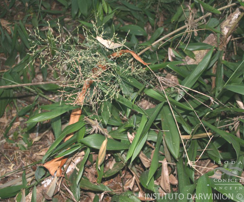 Hierba perenne de 30-80 cm de altura, rizomatosa, césped abundante hasta cerca de las inflorescencias; cañas simples, erectas o geniculadas en la base, plurinodes, nudos glabros; vainas glabras, más largas que los entrenudos; lígula de 1 mm de largo, membranácea, truncada, borde eroso; láminas de 4-15 x 2-5 cm, planas, lanceoladas o elípticas, con finas nervaduras transversales, glabras, escabriúsculas en el margen y envés, pseudopecioladas, pseudopecíolo de 0,5-2 mm de largo, retorcido, la torción de 180° en el ápice del mismo invirtiendo a la lámina. Inflorescencia de 12-20 x 4-8 cm, racemoso-paniculada, exerta, terminal, ramificaciones laterales terminando en una espiguilla estaminada desarrollada, generalmente quebradizas, rompiéndose y separándose de la planta, raquis subtrígono, pulvinado, cubierto de pelos uncinados no conspicuos; monoicas, con espiguillas dimorfas, 1-floras, la inferior femenina, sésil o subsésil y la superior masculina, pediceladas, a veces, pares de espiguillas femeninas o pares de espiguillas masculinas mezcladas en una misma inflorescencia o con predominancia de una de ellas. Espiguillas femeninas de 8,5 mm de largo, sésil o con pedicelo de ca. 1 mm de largo; glumas 2, lanceoladas, membranáceas, persistentes, castaño-purpúreas, glabras o escabriúsculas, la inferior de 4-5 mm de largo, 4-nervia, la superior de 3,5-4,5 mm de largo, 3-nervia; lemma de 7-10 mm de largo, subcilíndrica, con los márgenes involutos, ápice rostrado, cartilaginosa, 7-plurinerviada, cubierta de pelos uncinados, excepto el ápice, los márgenes y la parte media inferior del dorso que son escabriúsculos o glabros, castaña o amarillenta; pálea de 7,6 mm de ancho, linear, membranácea, binervada, bicarinada, con surco notable, pilosa, encerrada por la lemma; ovario de 1 mm de largo, estilo de ca. 7 mm de largo, enrrollado dentro del antecio y terminado en 3 ramas estigmáticas emergentes del mismo; lodículas 3, pequeñísimas; cariopsis de 5,5-7 x 0,8 mm, subcilíndrica, coronada por el resto del estilo seco, surco longitudinal profundo, encerrada en las glumelas y cayendo con ellas a la madurez; mácula embrional pequeña, basal; hilo linear; endosperma seco; espiguilla masculina de 2,5 mm de largo, pedicelada, pedicelo de 4-7 mm de ancho, adpreso al raquis, no desarticulándose, con pelos uncinados no conspicuos; glumas 2, lanceoladas, membranáceas, 1-nervias, castaño-purpúreas, la inferior de 1-1,5 mm de largo, la superior de 2-3 mm de largo, ovada, 3-nervia; lemma de 2,5 mm de largo, ovada, membranácea, 3-nervia, con venas transversales; pálea de casi igual longitud y consistencia que la lemma, 2-nervia, bidentada; androceo 6, anteras de 1-2,2 mm de largo.