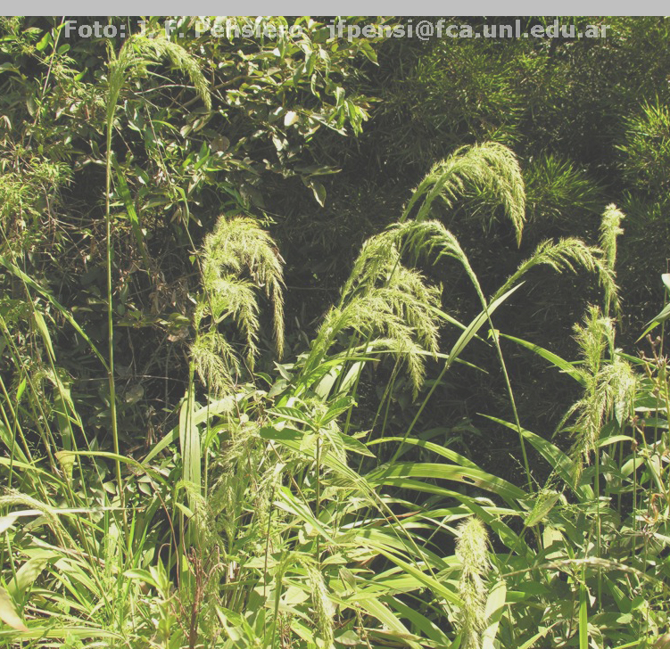 Plantas perennes, cespitosas, a veces estoloníferas, normalmente vigorosas, innovaciones intravaginales; cañas simples o ramificadas en la base, de 1-3 m de alto y 4-10(-15) mm de diámetro, plurinodes, velludas cerca de los nudos, internodios cubiertos; nudos glabros o pilosos; vainas con el dorso redondeado o aquillado, pubescentes, pelos por lo general de base en cojinete, cuello piloso, márgenes ciliados en toda su extensión o sólo cerca de la lígula; lígulas membranáceo-ciliadas de 1-6 mm de largo; láminas seudopecioladas, lanceoladas, claramente plegadas, de 20-60 x 1,3-10 cm, cara adaxial glabra o con algunos pelos aislados, la abaxial cortamente pubescente o glabra, nervio medio conspicuo, los márgenes escabrosos. Inflorescencia en panoja por lo general muy ramificada, piramidal, densa, erecta o péndula, de 20-70 x 2-10 cm o más, incluyendo las setas, ramas inferiores de 1,5-15 cm de largo; raquis escabroso pudiendo llevar algunos pelos largos laxamente distribuidos. Espiguillas angostamente ovoides de 3-3,5 x 1-1,2 mm, acompañadas algunas de ellas por una seta antrorso-escabrosa de 4-14 mm de largo; gluma inferior ?-½ del largo de la espiguilla, 3-5-nervia, de ápice obtuso; gluma superior alcanzando ½-¾ del largo del antecio superior, 5-7-nervia, de ápice obtuso o brevemente apiculado; lemma inferior igualando o superando ligeramente el largo del antecio superior al que envuelve notablemente, de consistencia membranosa o subcoriácea, 5-nervia, de ápice agudo; pálea inferior lanceolada, pudiendo igualar el largo de la pálea superior, ser menor o estar ausente; antecio superior angostamente ovoide, de 3-3,5 x 1-1,2 mm, pajizo, con lemma lisa o muy suavemente rugosa, lustrosa, acuminada, pudiéndose separar con facilidad de la pálea; cariopsis de 2 x 0,9-1 mm, escudete mayor de ½ de su longitud, hilo punctiforme.