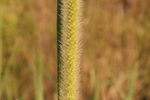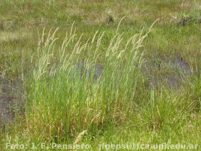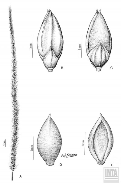 Plantas perennes, cespitosas, con cortos rizomas e innovaciones intravaginales; cañas simples o ramificadas, de 35-150(-200) cm de alto y 3-6 mm de diámetro; nudos 4-10 por caña, glabros; vainas basales dispuestas en forma flabelada, de aspecto iridáceo, glabras o con pelos aislados de base en cojinete, márgenes membranáceos, hialinos, glabros; lígulas membranáceo-ciliadas, de 1,2-1,5(-2) mm de largo; láminas lineares o linear-lanceoladas, planas o convolutas, de 10-25(-35) cm x (3-)5-10 mm, ligeramente escabrosas, de ápice agudo y nervio central conspicuo. Inflorescencia en panoja espiciforme, continua, densa, de 12-30 cm x 9-14 mm incluyendo las setas, ramificaciones inferiores muy breves, de 5-8 mm de largo; raquis escabroso. Espiguillas ovoides de 2,4-2,8 x 1-1,4 mm, acompañadas por 4-9 setas involucrales antrorso-escabrosas, de 3-7 mm de largo; gluma inferior alcanzando ?-½ del largo de la espiguilla, 3-nervia, de ápice obtuso o agudo; gluma superior ½-¾ del largo del antecio superior, 5-nervia; antecio inferior a veces estaminado, generalmente asexuado, con lemma de igual largo que la lemma superior, 5-7-nervia; pálea inferior desarrollada, de igual largo que la pálea superior; estambres, cuando presentes, de 0,8-1,5 mm de largo; antecio superior ovoide de 2,4-2,8 x 1-1,4 mm, pajizo o castaño, lemma rugosa, brevemente apiculado; cariopsis no vista.