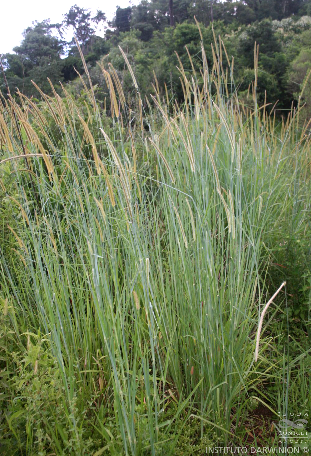 Plantas perennes, cespitosas, con cortos rizomas e innovaciones intravaginales; cañas simples o ramificadas, de 35-150(-200) cm de alto y 3-6 mm de diámetro; nudos 4-10 por caña, glabros; vainas basales dispuestas en forma flabelada, de aspecto iridáceo, glabras o con pelos aislados de base en cojinete, márgenes membranáceos, hialinos, glabros; lígulas membranáceo-ciliadas, de 1,2-1,5(-2) mm de largo; láminas lineares o linear-lanceoladas, planas o convolutas, de 10-25(-35) cm x (3-)5-10 mm, ligeramente escabrosas, de ápice agudo y nervio central conspicuo. Inflorescencia en panoja espiciforme, continua, densa, de 12-30 cm x 9-14 mm incluyendo las setas, ramificaciones inferiores muy breves, de 5-8 mm de largo; raquis escabroso. Espiguillas ovoides de 2,4-2,8 x 1-1,4 mm, acompañadas por 4-9 setas involucrales antrorso-escabrosas, de 3-7 mm de largo; gluma inferior alcanzando ?-½ del largo de la espiguilla, 3-nervia, de ápice obtuso o agudo; gluma superior ½-¾ del largo del antecio superior, 5-nervia; antecio inferior a veces estaminado, generalmente asexuado, con lemma de igual largo que la lemma superior, 5-7-nervia; pálea inferior desarrollada, de igual largo que la pálea superior; estambres, cuando presentes, de 0,8-1,5 mm de largo; antecio superior ovoide de 2,4-2,8 x 1-1,4 mm, pajizo o castaño, lemma rugosa, brevemente apiculado; cariopsis no vista.