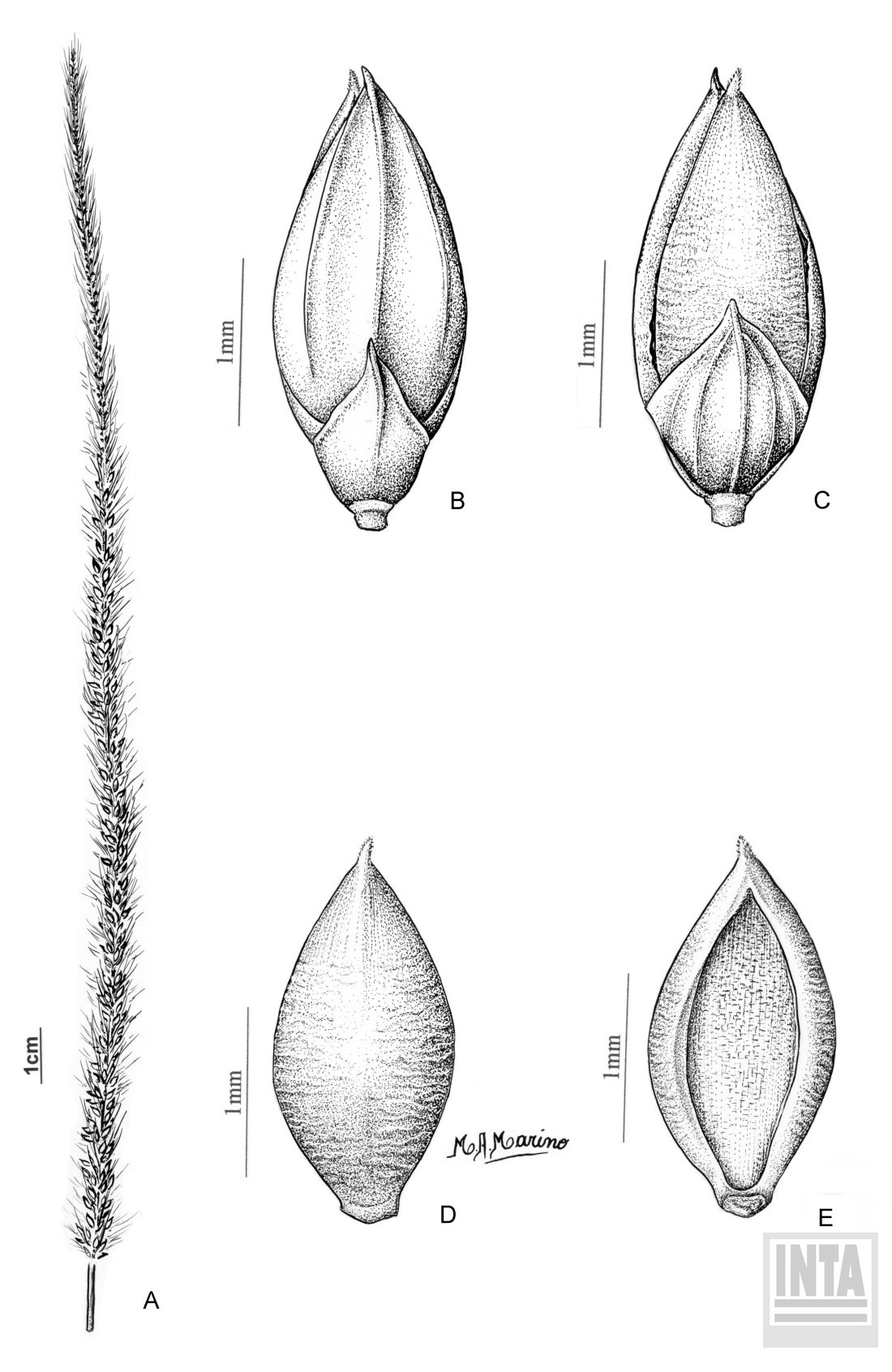 A. Inflorescencia. B. Espiguilla vista ventral. C. Espiguilla vista dorsal. D. Antecio superior vista dorsal. E. Antecio superior vista ventral.
