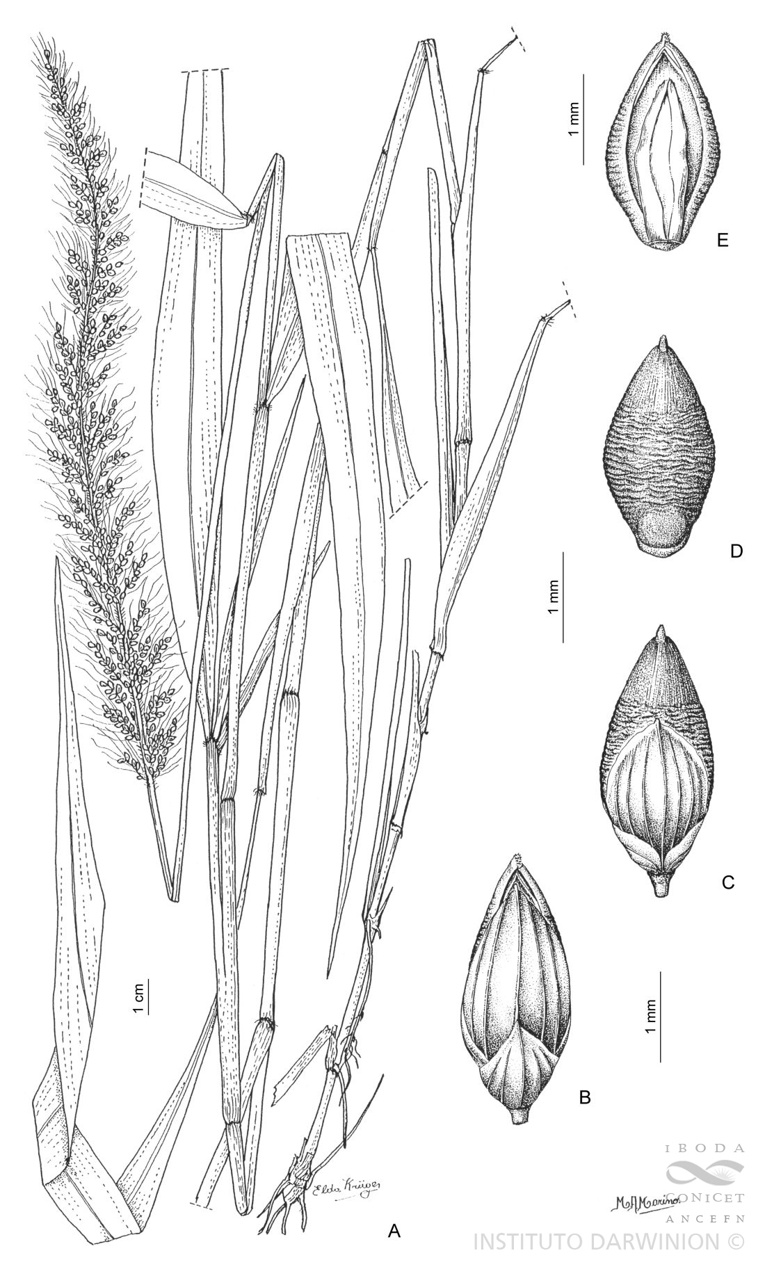 Plantas perennes, cespitosas, a veces brevemente estoloníferas, innovaciones intravaginales; cañas simples o ramificadas, de 50-150(-200) cm de alto y 2-3 mm de diámetro; nudos 3-5(-10) por caña, glabros o pubescentes ; internodios inferiores normalmente pubescentes, los superiores glabros; vainas aquilladas, por lo general pubescentes, pelos de 1-1,5 mm de largo de base en cojinete, cuello normalmente piloso, los márgenes ciliados; lígulas membranáceo-ciliadas de 1-3(-4) mm de largo; láminas linear-lanceoladas o lanceoladas de 15-30 x 1-3 cm, planas, frecuentemente las inferiores seudopecioladas, glabras o con abundantes pelos especialmente a los costados del nervio medio de la cara adaxial, escabrosas, nervios conspicuos, ápice gradualmente atenuado, agudo. Inflorescencia en panoja piramidal, más o menos densa, de 10-35 x 2-5 cm incluyendo las setas, ramificaciones inferiores de 1,5-4 cm de largo, con espiguillas dispuestas en forma más o menos unilateral; raquis hirsuto, visible en casi toda su extensión, pelos antrorsos. Espiguillas ovoides de 2,5-3 x 1,2-1,5 mm, con 1(-3) setas antrorso-escabrosas de 7-20 mm de largo; gluma inferior alcanzando ½ del largo de la espiguilla, 3-5-nervia, ápice obtuso, agudo o apiculado; gluma superior cubriendo ¾ del antecio superior, (5-)7-9-nervia, brevemente apiculada; lemma inferior de igual largo que la lemma superior, 5-7-nervia, apiculada; pálea inferior igual o algo menor que el largo de la pálea superior, amplia; antecio superior ovoide, de 2,5-3 x 1,1-1,5 mm, lemma rugosa en su parte media y base, ápice más o menos liso, apiculado, lustroso; cariopsis elipsoide de 1,6-1,7 x 1 mm, escudete alcanzando ¾ de su largo, hilo punctiforme.