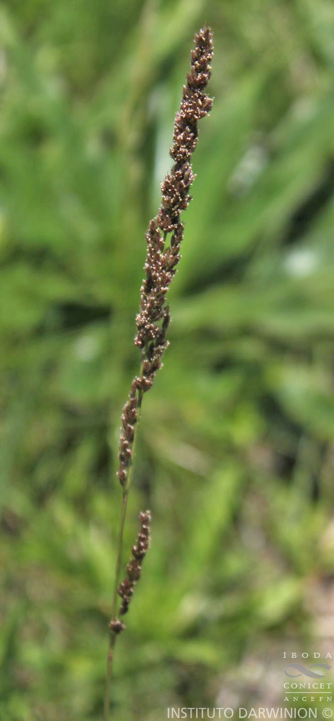 Plantas perennes, cespitosas, de 80-150 cm de alto; cañas erectas, 3-nodes; vainas glabras; lígulas pestañosas; láminas estrechas, lineares, agudas, aluminadas, de 15-30 cm x 4-6 mm. Inflorescencia en panoja contraída, densa, multiespiculada, algo interrumpida en la base, de 12-25 cm de largo. Espiguillas 8-10-floras, articuladas y fácilmente caducas; raquilla articulada arriba de las glumas y entre los antecios, con artejos breves; glumas carinadas, 1-nervias, isomorfas, ca. 3 mm de largo; lemma lanceolada, de 3-3,5 mm de largo, 3-nervias, nervaduras ciliadas terminadas en breves aristas, la central de 1-1,5 mm de largo, las laterales de 0,7 mm de largo, nervaduras pestañosas en su ½ inferior, pestañas de las nervaduras laterales tiesas y divergentes, ca. 1 mm de largo, las de la nervadura central menores; pálea glabra, lanceolada, de ápice romo, ensanchada hacia la base, tan larga como la lemma; flores perfectas; anteras de 0,5 mm de largo; cariopsis aovada, elíptica, deprimida, de 1,5 mm de largo.