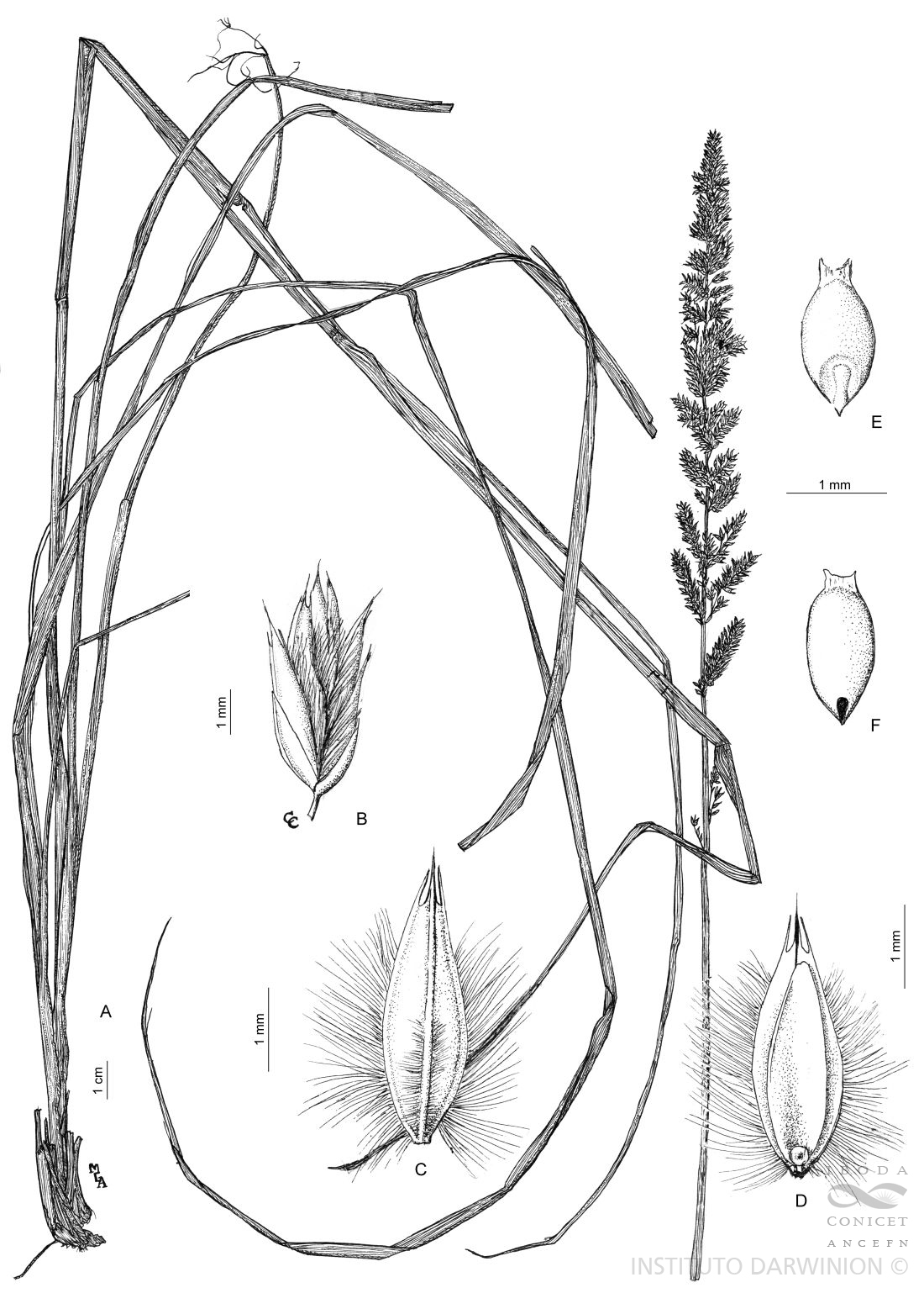 Plantas perennes, cespitosas, de 80-150 cm de alto; cañas erectas, 3-nodes; vainas glabras; lígulas pestañosas; láminas estrechas, lineares, agudas, aluminadas, de 15-30 cm x 4-6 mm. Inflorescencia en panoja contraída, densa, multiespiculada, algo interrumpida en la base, de 12-25 cm de largo. Espiguillas 8-10-floras, articuladas y fácilmente caducas; raquilla articulada arriba de las glumas y entre los antecios, con artejos breves; glumas carinadas, 1-nervias, isomorfas, ca. 3 mm de largo; lemma lanceolada, de 3-3,5 mm de largo, 3-nervias, nervaduras ciliadas terminadas en breves aristas, la central de 1-1,5 mm de largo, las laterales de 0,7 mm de largo, nervaduras pestañosas en su ½ inferior, pestañas de las nervaduras laterales tiesas y divergentes, ca. 1 mm de largo, las de la nervadura central menores; pálea glabra, lanceolada, de ápice romo, ensanchada hacia la base, tan larga como la lemma; flores perfectas; anteras de 0,5 mm de largo; cariopsis aovada, elíptica, deprimida, de 1,5 mm de largo.