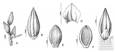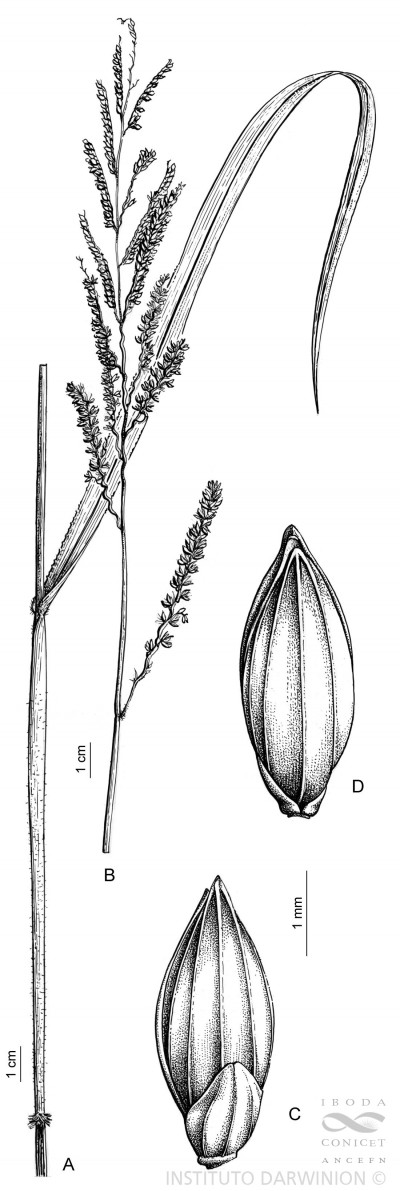 Plantas perennes de 1-2(-3) m de alto; cañas multinodes, decumbentes, rastreras, hasta de 5 m de largo, arraigadas y ramificadas en los nudos inferiores, luego ascendentes; entrenudos de 10-25 cm de largo, estriados, glabros, teretes, huecos; nudos no comprimidos, vilosos, con pelos blanquecinos; vainas de 10-25 cm de largo, tan largas o menores que los entrenudos, hirsutas a glabras hacia la porción apical, con pelos tuberculados entre los nervios, los bordes pestañosos; lígulas cortamente membranáceas hacia la base, luego largamente pestañosas, de 1-1,5 mm de largo, subrectas; láminas linear-lanceoladas, de 10-35 x 1-2 cm, glabras a esparcidamente pilosas en ambas caras, base subcordada y ápice largamente atenuado, bordes cartilaginosos, escabrosos. Inflorescencias radiadas, piramidales, exertas, de 10-25 x 5-10 cm, terminales, largamente pedunculadas; eje principal anguloso, ángulos escabrosos, con 10-30 ramificaciones de primer orden, racemosas, alternas a subverticiladas, ascendentes y divergentes; raquis de las ramificaciones de 2,5-8 cm x 0,4-0,9 mm, plano, glabro con escasos pelos en ambas caras, tiesos, de base tuberculada, márgenes finamente escabrosos; pulvínulos pilosos; ramificaciones de segundo orden presentes; pedicelos hasta ca. 2 mm de largo, angulosos a triquetros, escabrosos, esparcidamente pilosos, con pelos blanquecinos y tiesos, de base tuberculada; espiguillas dispuestas en 2-4 o más series sobre un lado del raquis, solitarias hacia el ápice de las ramificaciones, luego en pares, cuando en pares la inferior subsésil y la restante pedicelada. Espiguillas largamente ovoides, de 2,8-3,5 x 1-1,4 mm, glabras, verdosas a purpúreas; gluma superior y lemma inferior subiguales, con nervios conspicuos; gluma inferior ovada, 0,6-1,1 mm de largo, 1/5-? del largo de la espiguilla, adaxial y abaxial, de ápice obtuso a subagudo, membranácea, glabra, no abrazadora, 1(-3)-nervia; gluma superior de 2,6-3,4 mm de largo, membranácea, glabra, de ápice finamente escabroso, 5(-7)-nervia; lemma inferior glumiforme, 5-nervia; pálea inferior lanceolada, de 2,6-3,5 mm de largo, tan larga o mayor que la lemma, ocasionalmente sobresaliendo entre la gluma superior y la lemma inferior, hialina, glabra, 2- nervia; flor inferior estaminada; lodículas 2, ca. 0,3 mm de largo; estambres 3, anteras de 1,2-1,4 mm de largo, púrpuras; antecio superior elipsoide, de 2,3-2,8 x 1-1,3 mm, cortamente apiculado, plano convexo, pajizo, endurecido, transversalmente rugoso, lemma de dorso convexo y rugoso, bordes involutos, lisos y lustrosos; lodículas 2, similares a las de la flor inferior; estambres 3, anteras de 1-1,3 mm de largo; cariopsis ovoide, ca. 2 mm de largo; hilo elíptico, sub-basal; embrión hasta de ½ del largo de la cariopsis.