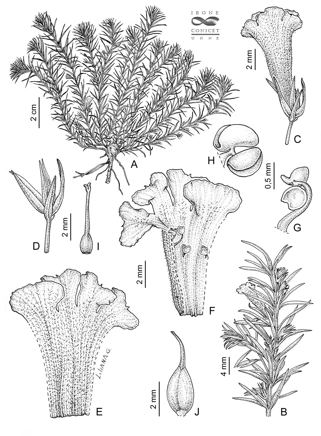 Hierbas erectas o decumbentes, estoloníferas, de hábito cespitoso, de 8 a 20 cm de alto, ramificada desde la base. Tallos erguidos o decumbentes, glabros a pubescentes, con cuatro costillas, entrenudos cortos, de 2-5 mm de largo, con tricomas glandulares pedicelados pluricelulares, uniseriados, y tricomas eglandulares. Hojas verticiladas, 4 (raro 5-8) por nudo, sésiles, aciculares a lineares, de 6-14 × 0,5-1 mm, uninervadas, ligeramente pubescentes, con tricomas glandulares y eglandulares abundantes en los márgenes, margen denticulado. Flores solitarias, axilares, subsésiles, pedicelos de 0,1-2 mm de largo, bractéolas 2, linear- lanceoladas, de 3 mm de largo. Cáliz con 5 sépalos iguales, linear-lanceolados, de 3 a 5 mm de largo, glandular- pubescentes. Corola violácea, infundibuliforme, de 9-11 mm de largo, muy pubescente con pelos glandulares, ausentes en los labios inferiores; estambres 4, 2 filamentos breves de 0,5 mm de largo y 2 mayores de 1 mm de largo, inclusos, insertos en la parte superior del tubo, anteras oblongas; ovario elipsoide, glabro, estigma bibraqueado, con dos ramas gruesas. Cápsula ovoide, de 3 mm de largo, 4-valvar. Semillas ovoides a elipsoides.
