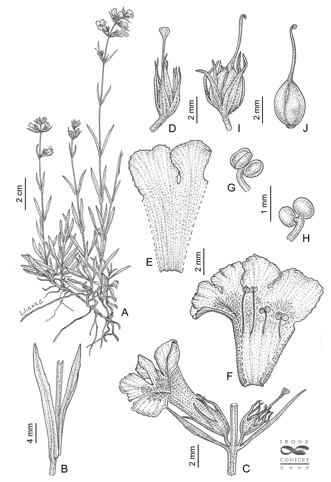 A. Planta. B. detalle del nudo con hojas. C. Detalle del nudo con flores. D. Cáliz. E. Parte externa de la corola. F. Corola extendida con androceo. G. Antera larga. H. Antera corta. I. Gineceo maduro con cáliz. J. Gineceo maduro.