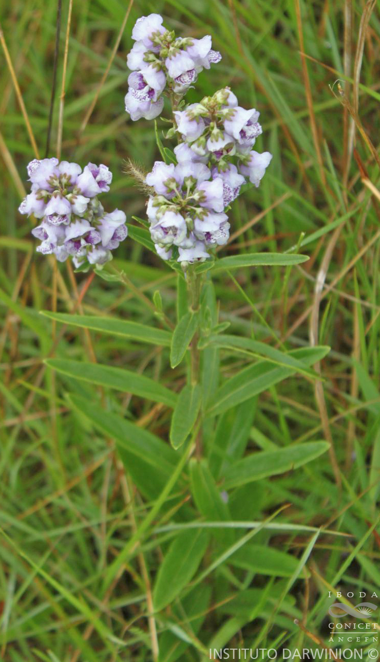 Hierbas perennes, glabras, hasta de 100 cm de alto. Hojas opuestas, sésiles; láminas angostamente elípticas a obovadas, de 8-13 × 1,5(-3) cm, margen entero, en ocasiones muy ligeramente denticulado, nervaduras notorias en cara abaxial. Flores 2-3 en la axila de brácteas foliáceas de 0,4-1,2 cm de largo, formando racimos terminales, de 15-20 cm de largo; pedicelos de 0,8-1,4 cm de largo; bractéolas lineares, muy breves, de 0,15-0,2 mm de largo. Cáliz 5-lobado, lóbulos de 4-5 mm de largo, márgenes membranáceos. Corola ca. 1,5 cm de largo, color azul claro con manchas violetas, tubo breve. Cápsulas ovado–piriformes, de 1,2-2 × 0,7-0,8 cm, pardo-amarillentas.