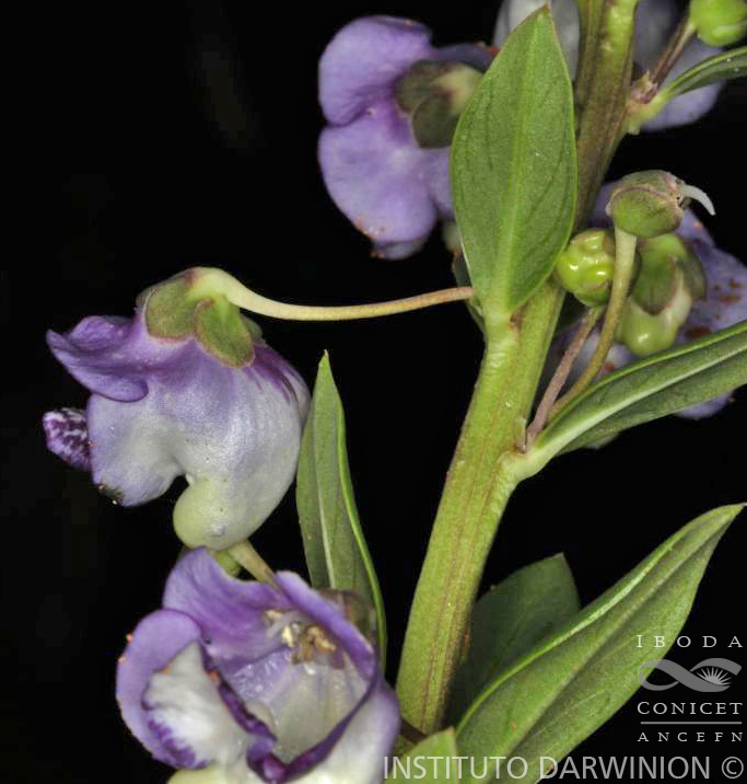 Hierbas perennes, glabras, hasta de 100 cm de alto. Hojas opuestas, sésiles; láminas angostamente elípticas a obovadas, de 8-13 × 1,5(-3) cm, margen entero, en ocasiones muy ligeramente denticulado, nervaduras notorias en cara abaxial. Flores 2-3 en la axila de brácteas foliáceas de 0,4-1,2 cm de largo, formando racimos terminales, de 15-20 cm de largo; pedicelos de 0,8-1,4 cm de largo; bractéolas lineares, muy breves, de 0,15-0,2 mm de largo. Cáliz 5-lobado, lóbulos de 4-5 mm de largo, márgenes membranáceos. Corola ca. 1,5 cm de largo, color azul claro con manchas violetas, tubo breve. Cápsulas ovado–piriformes, de 1,2-2 × 0,7-0,8 cm, pardo-amarillentas.