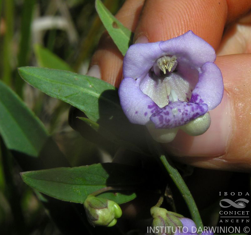 Hierbas perennes, glabras, hasta de 100 cm de alto. Hojas opuestas, sésiles; láminas angostamente elípticas a obovadas, de 8-13 × 1,5(-3) cm, margen entero, en ocasiones muy ligeramente denticulado, nervaduras notorias en cara abaxial. Flores 2-3 en la axila de brácteas foliáceas de 0,4-1,2 cm de largo, formando racimos terminales, de 15-20 cm de largo; pedicelos de 0,8-1,4 cm de largo; bractéolas lineares, muy breves, de 0,15-0,2 mm de largo. Cáliz 5-lobado, lóbulos de 4-5 mm de largo, márgenes membranáceos. Corola ca. 1,5 cm de largo, color azul claro con manchas violetas, tubo breve. Cápsulas ovado–piriformes, de 1,2-2 × 0,7-0,8 cm, pardo-amarillentas.